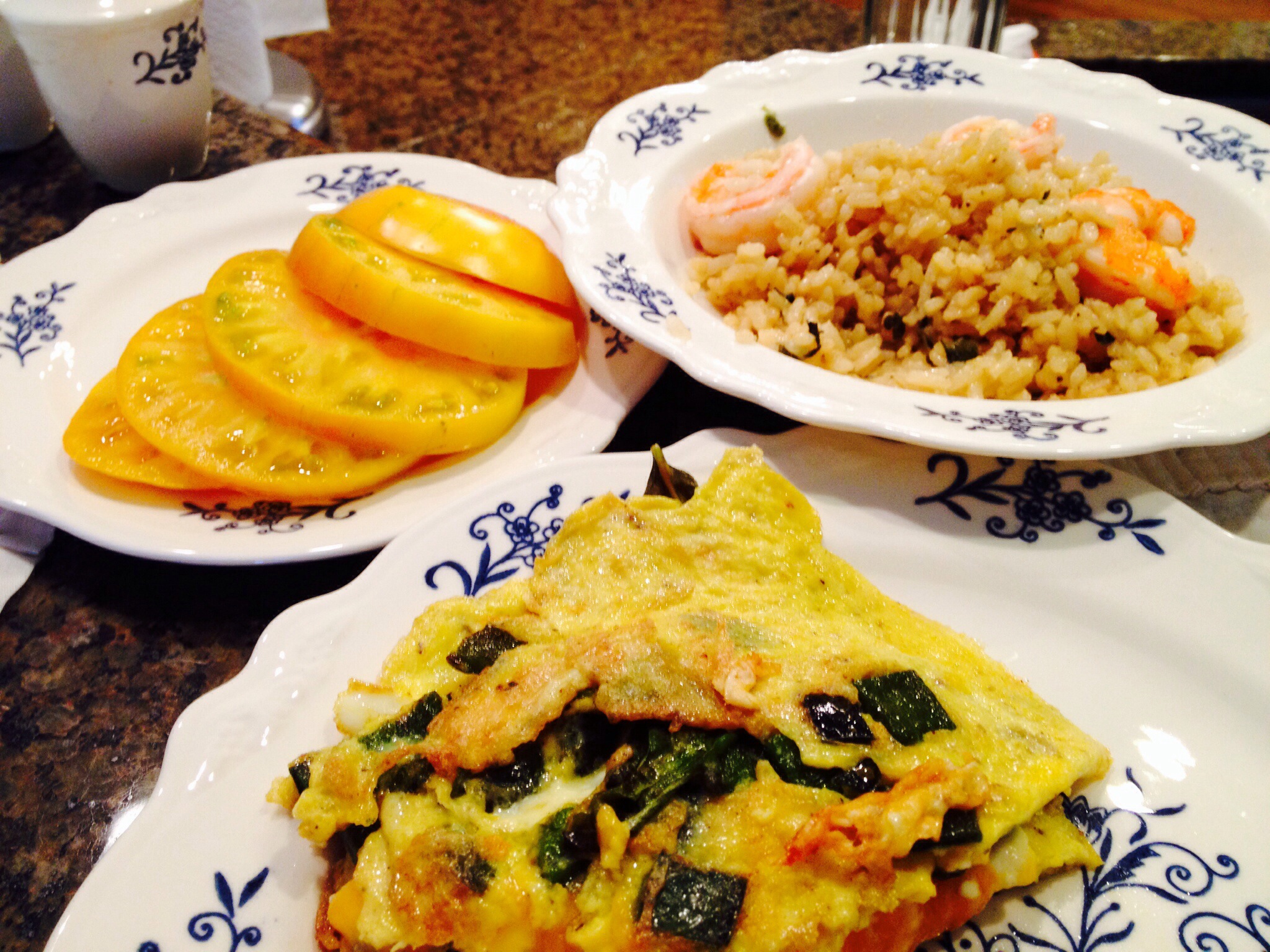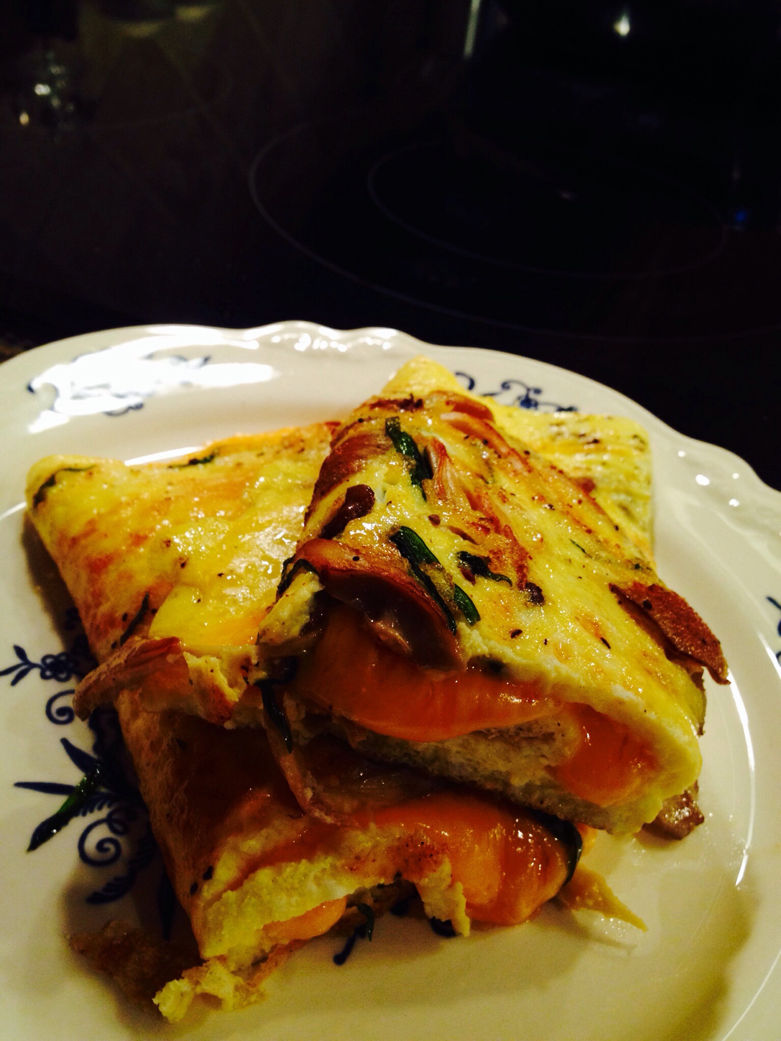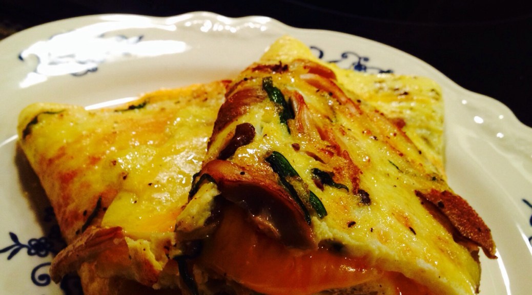 We always start our eggs by adding butter to a nonstick pan with poblano peppers or mushrooms or both. We throw in fresh herbs. Tarragon has been a favorite lately, but in the Summer when it’s plentiful, basil is the usual choice.  We shred cheese, usually a sharp cheddar. We found a 3 year cheddar at a local cheese shop recently. It makes a difference to use special cheese. Feta adds even more yum.