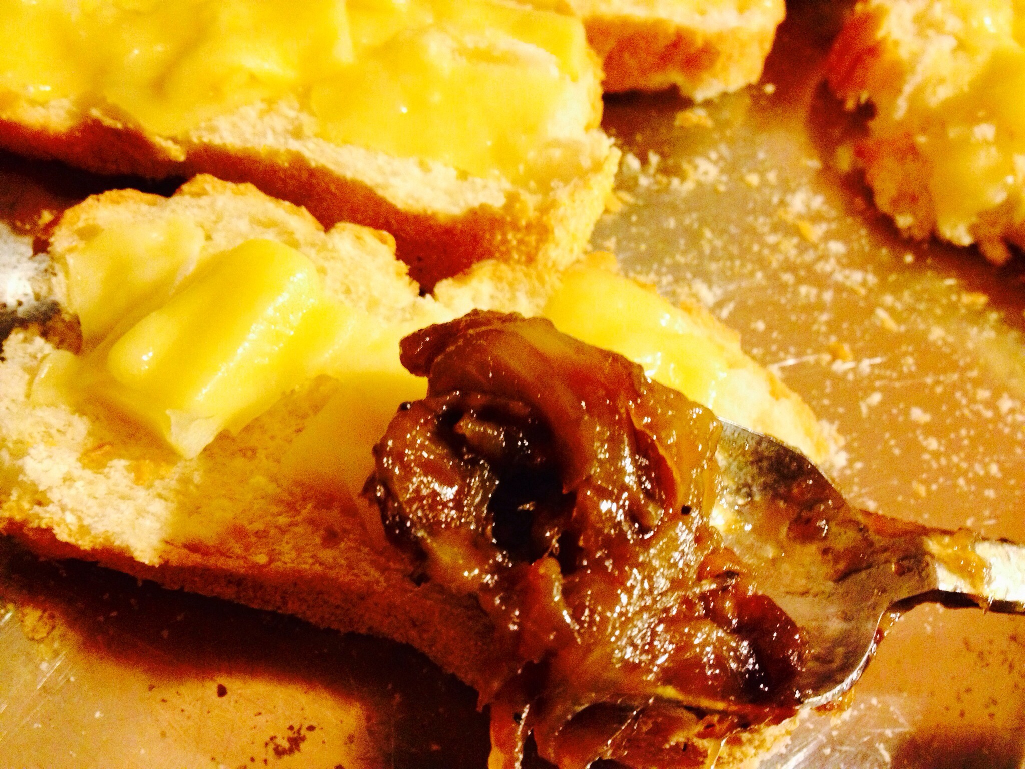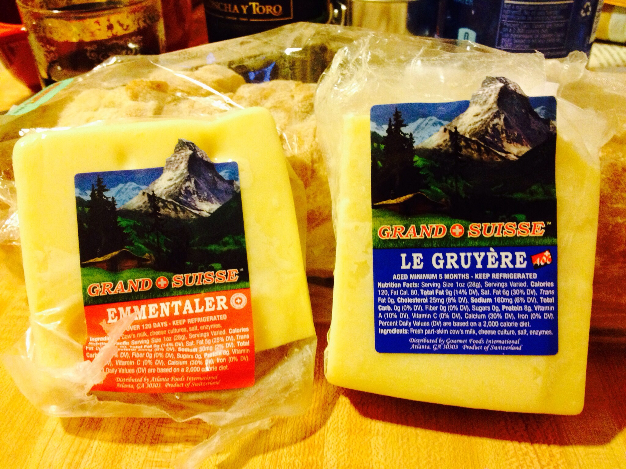 Cut a slice of crusty or hard bread and put the gruyere and/or the emmenthaler cheese on top. Broil it until bubbly and light brown.