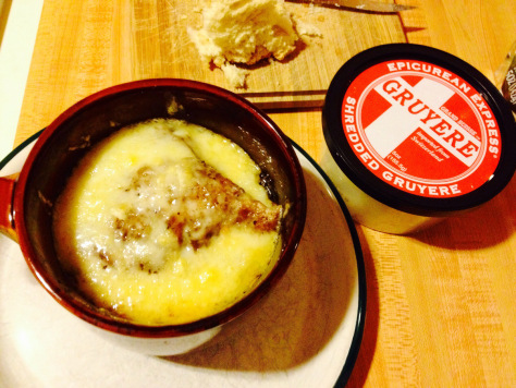 Good onion soup takes love and devotion. The onions take at minimum an hour, and often two hours, to get to the right stage of carmelization. I start with 5 or 6 large onions. Sometimes I get different types to mix together. They’re all delicious once they’ve been cooked forever. I slice them lengthwise and into half rings. Wide slices are fine. Cook them over medium heat — stir frequently for uniform cooking, and to prevent sticking —  until they’re dark brown but not burned and black. Add beef stock and red wine. You can thicken it with flour but I don’t.