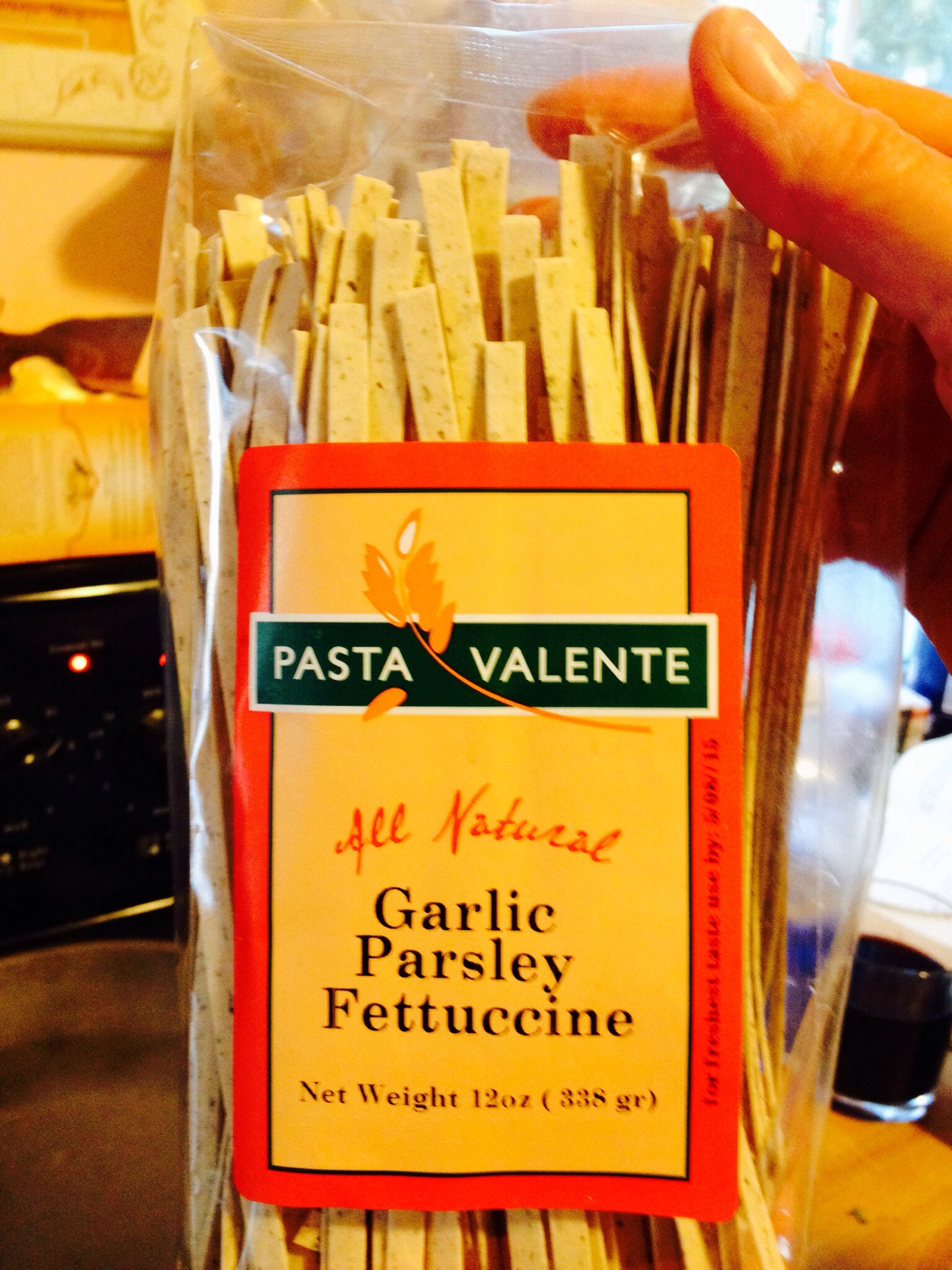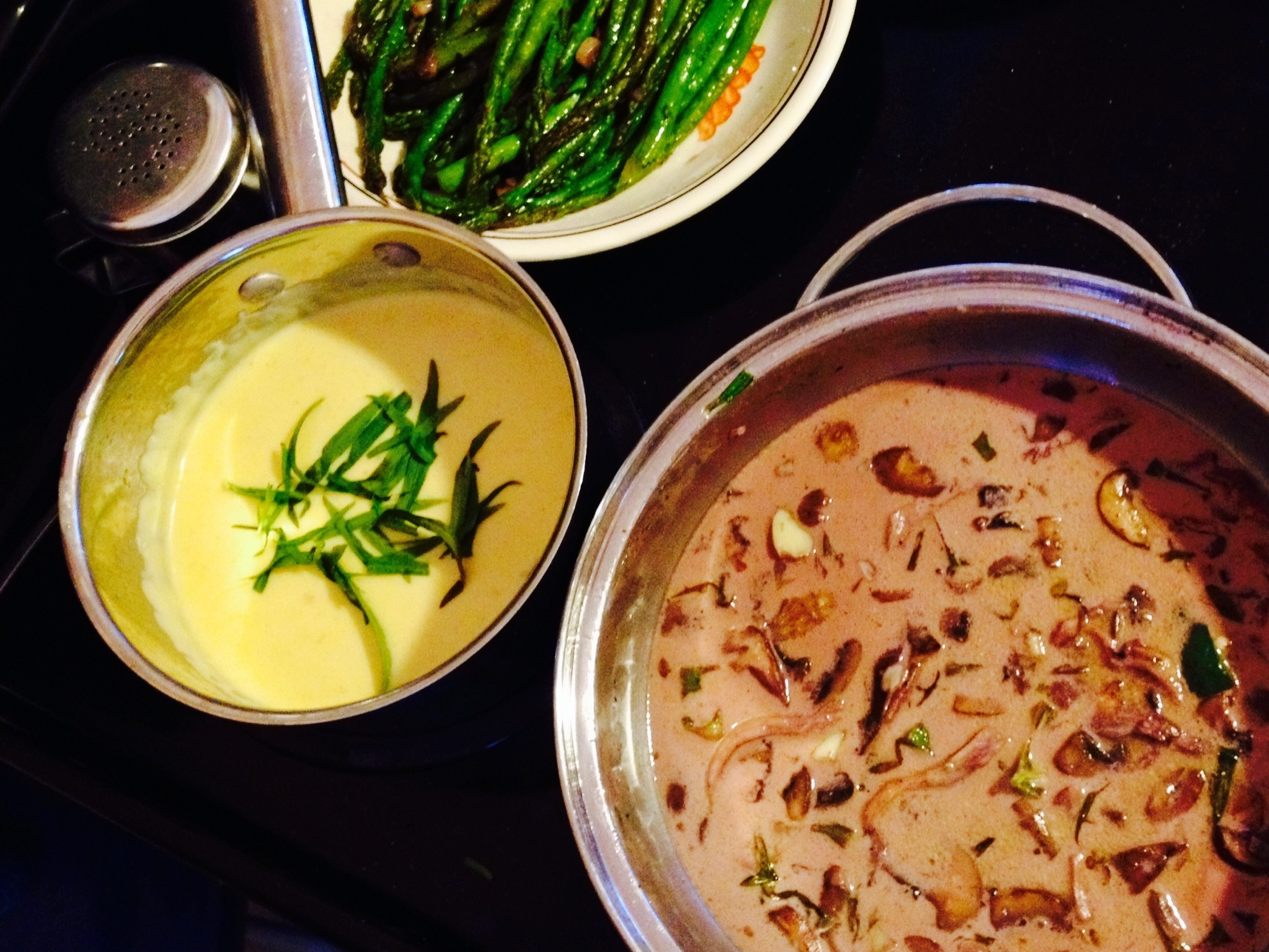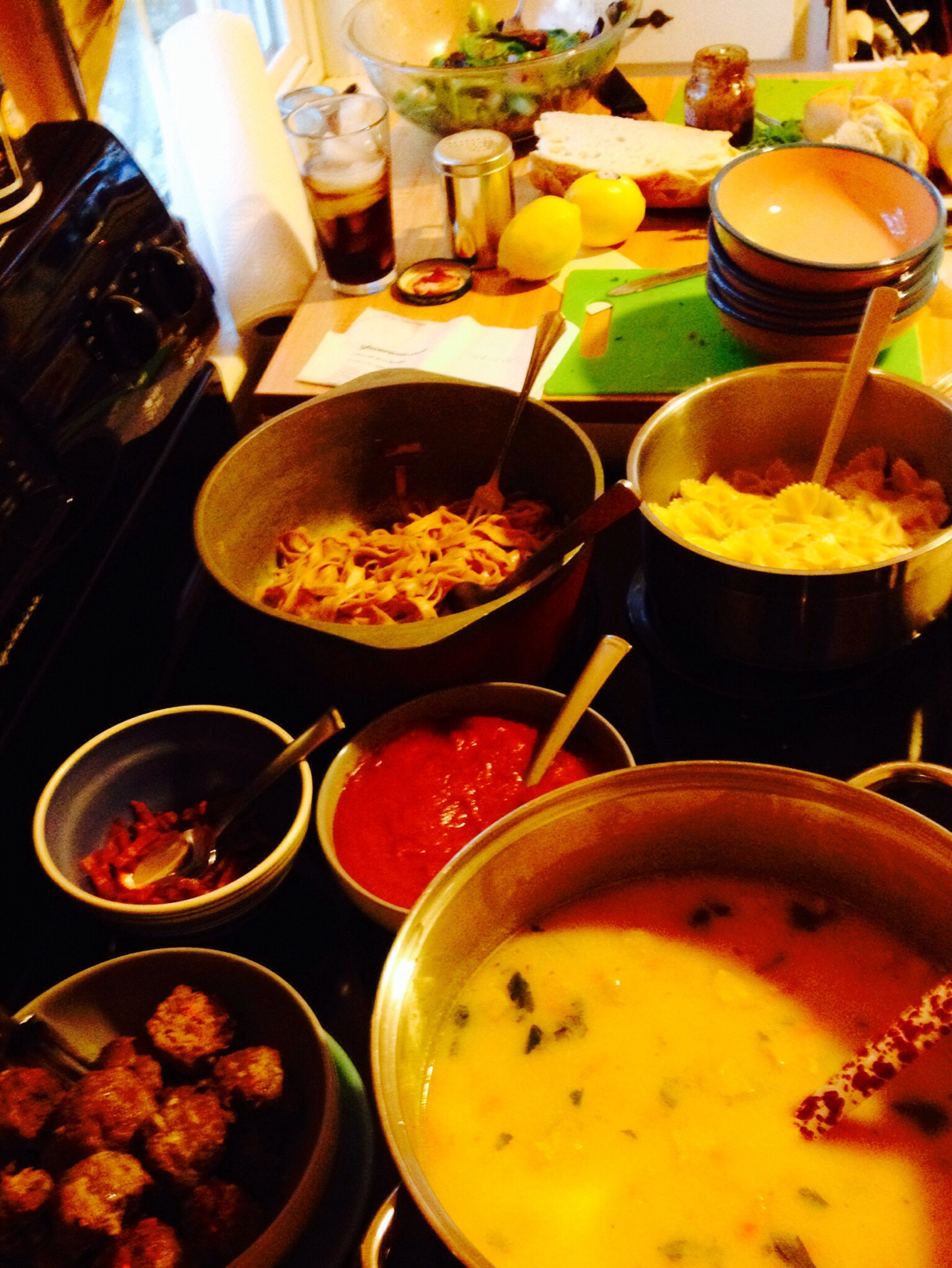 Our Saturday night easy meal for friends: Sun Dried Tomato Linguine (Farfalle (bow-tie pasta) for the kids) with Marinara and homemade meatballs, Potato Soup, fruit salad and the ubiquitous bacon crumbles as a garnish.