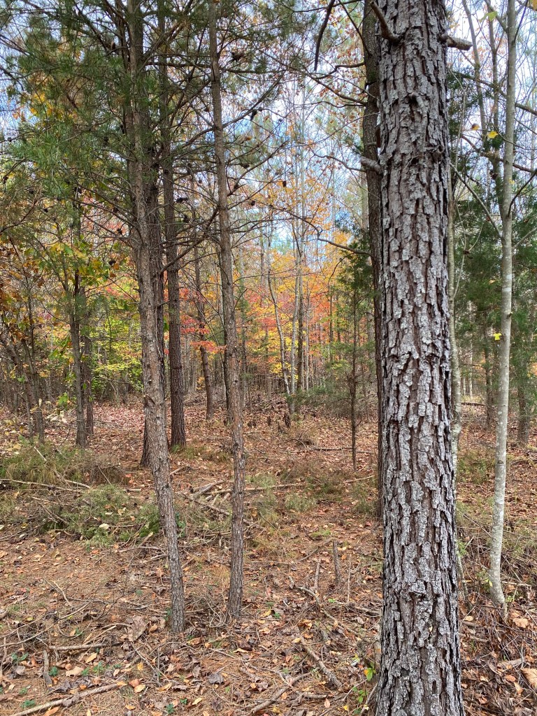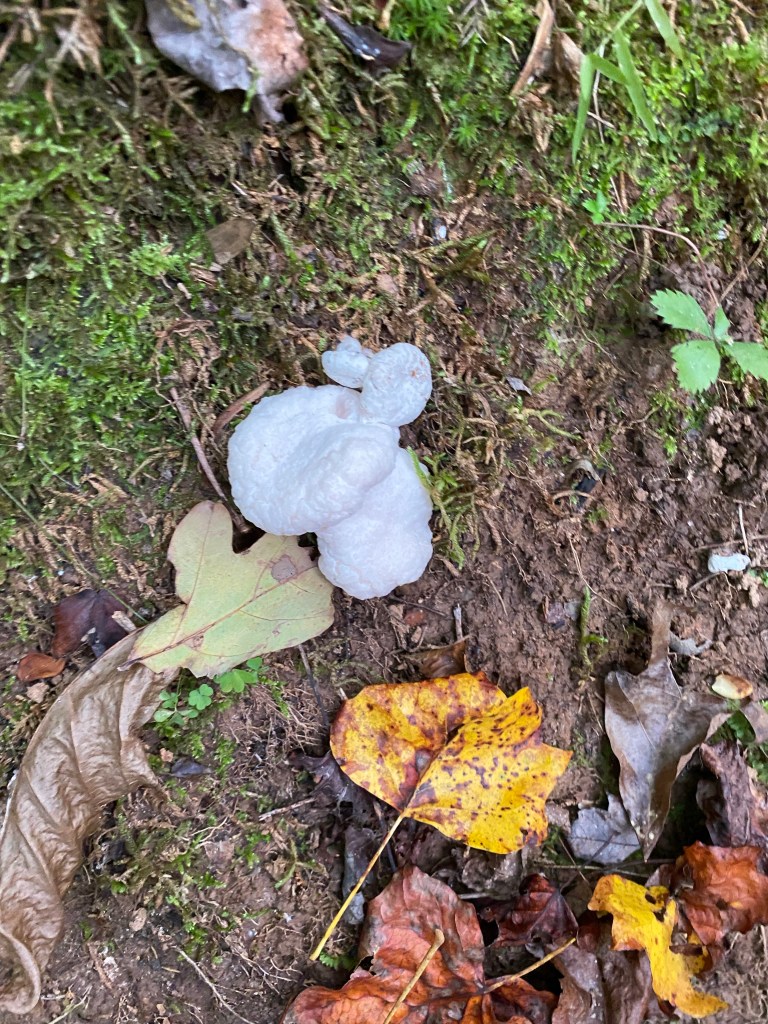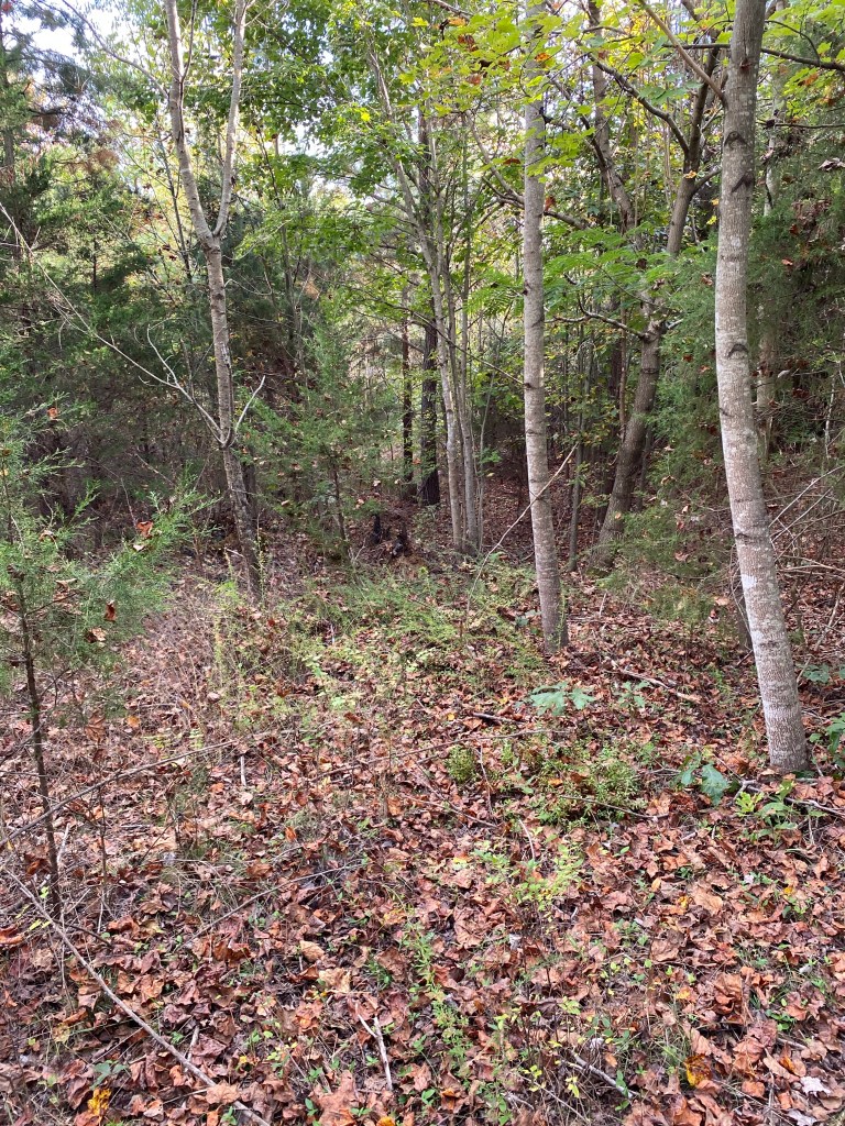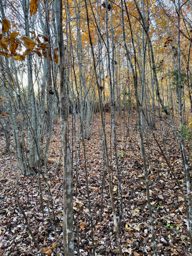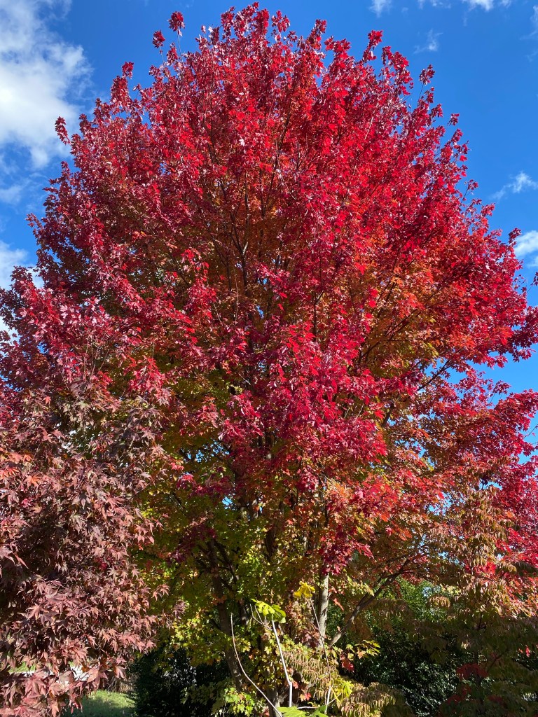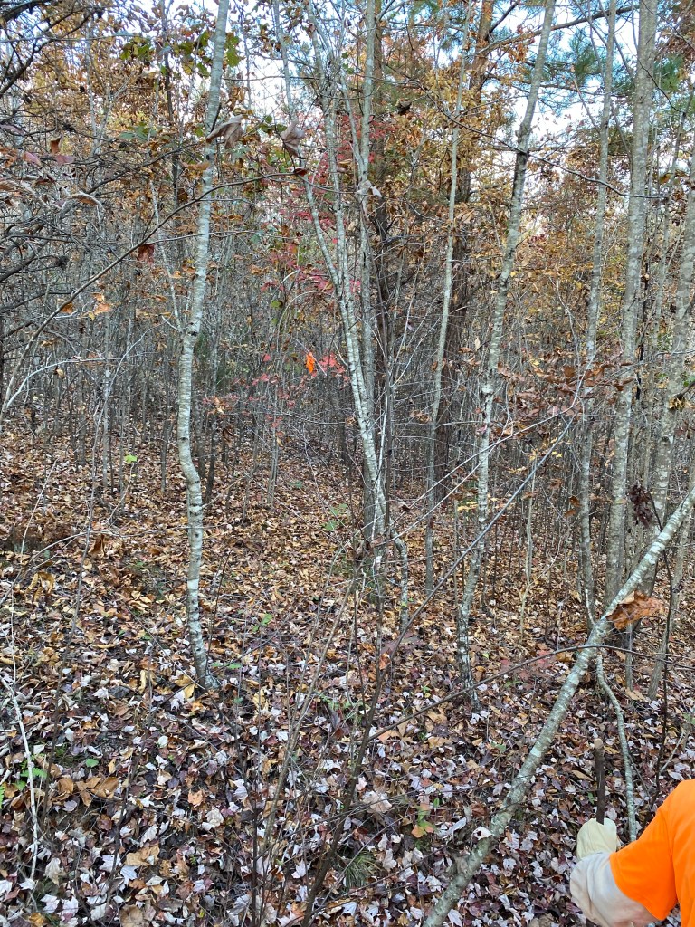 The old end of Chanterelle Trail where we connected it yesterday. My orange shirt is tied to a limb to the left of center. From trail, this is what we saw. When we got in closer, we saw a tunnel. We think it’s a fox den and we’ve seen a red fox a few times in the areaFall SAFF 2023Bonus maple 🍁 from our front yard in Staunton