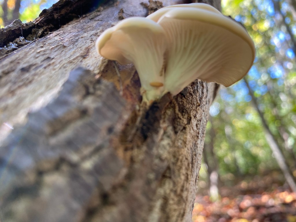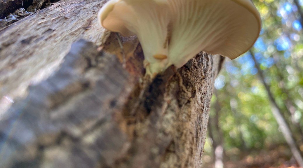 We will need to watch this spot for regrowth as tree of Heaven roots are similar to bamboo. It’s the most invasive, destructive tree we’ve encountered. It had not gotten more than a toe- hold in this section with 2 medium-sized trees in the understory of larger pines and oaks and about 30 smaller ones sprouting out in circles from the others before we pulled what we could see out. Happily, we also found oyster mushrooms growing in that same area. A dead tree had oysters throughout, top to bottom. We could see the white network of mycelium. They are decomposers and eat dead hardwood. We were happy to use this wood to inoculate other dead trees.