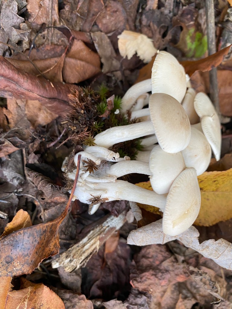 Along the south end, by St Andrew’s Road, we cut in alongside of the power lines and then dropped in to follow the waterway heading down to the creek. We found large fairy rings and clusters of white mushrooms called Entoloma sinuatum.