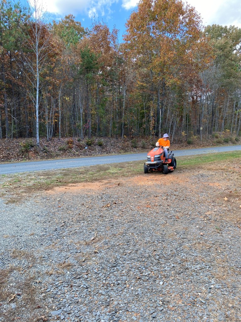We planted our first cover crop last week of crimson clover and winter rye on almost an acre and then topped it with straw bales to hold moisture. When we arrived today, we mowed and picked up trash along the road.