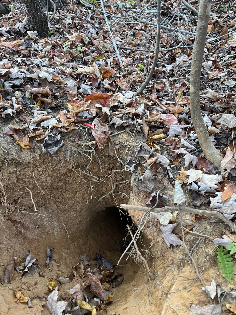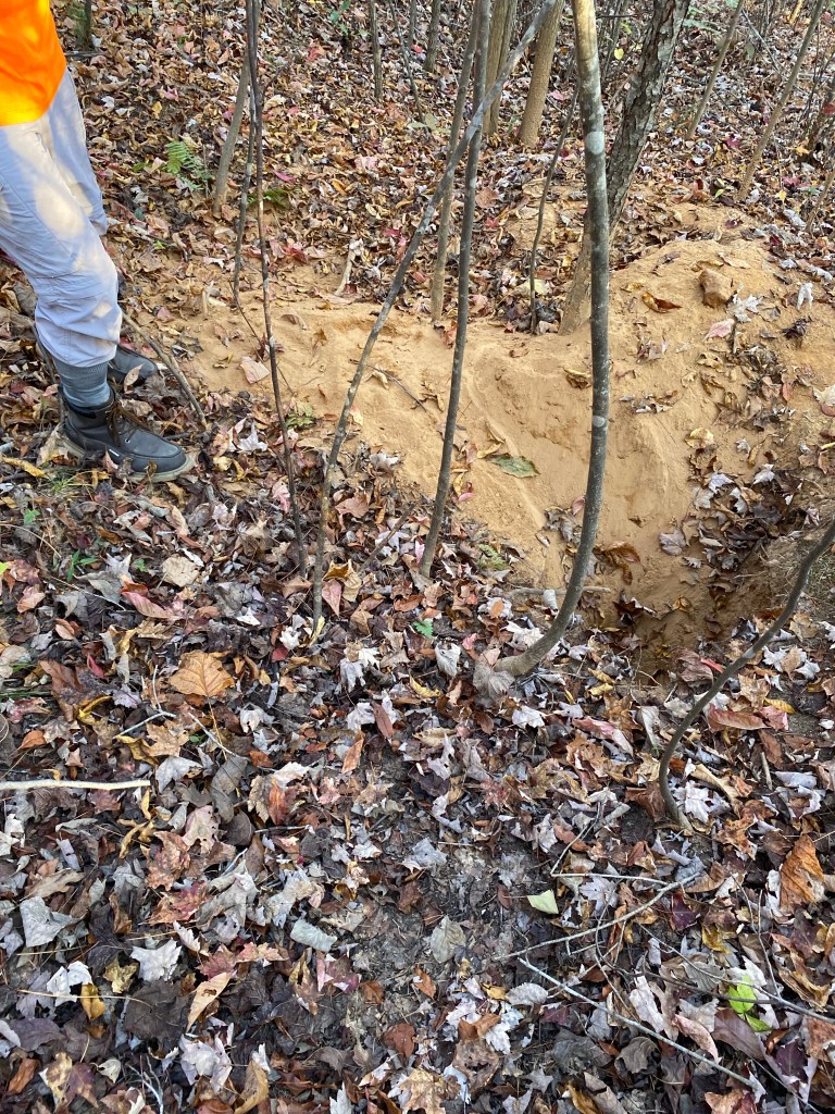 We decided to work on connecting Chanterelle Trail from the North Trail towards the South Trail. We had to cut back through hundreds of small, diseased and dying trees. Many tulip poplar, maples, dogwoods and some pine. We worked our way up and then tied my orange shirt to a tree limb and walked back around from the South Trail to Chanterelle Trail. We were only 15 or 20 yards away! It was here we found a fox den with tracks all around it.