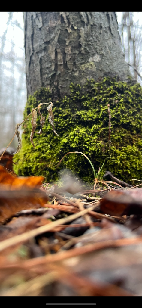 Today we startled a rabbit as we walked through the woods in the misty rain. Somehow we caught him by surprise, crunching up the hillside behind the shed. He startled and panicked, ran 50 feet away, then stopped, stretched his legs and shook it off.