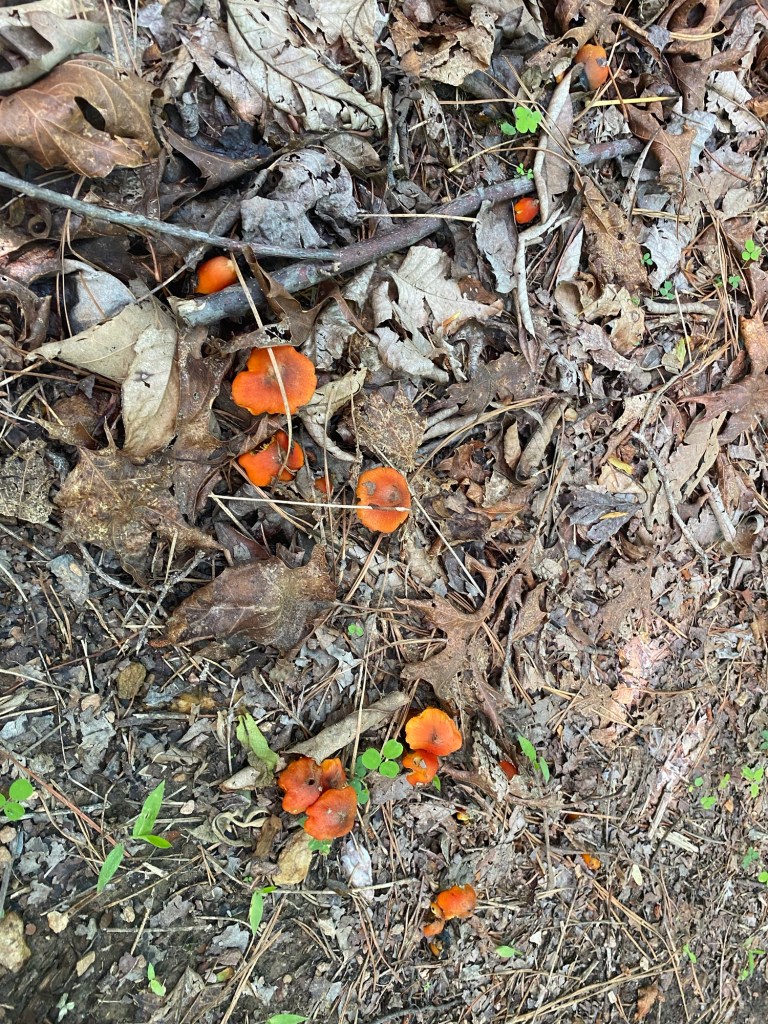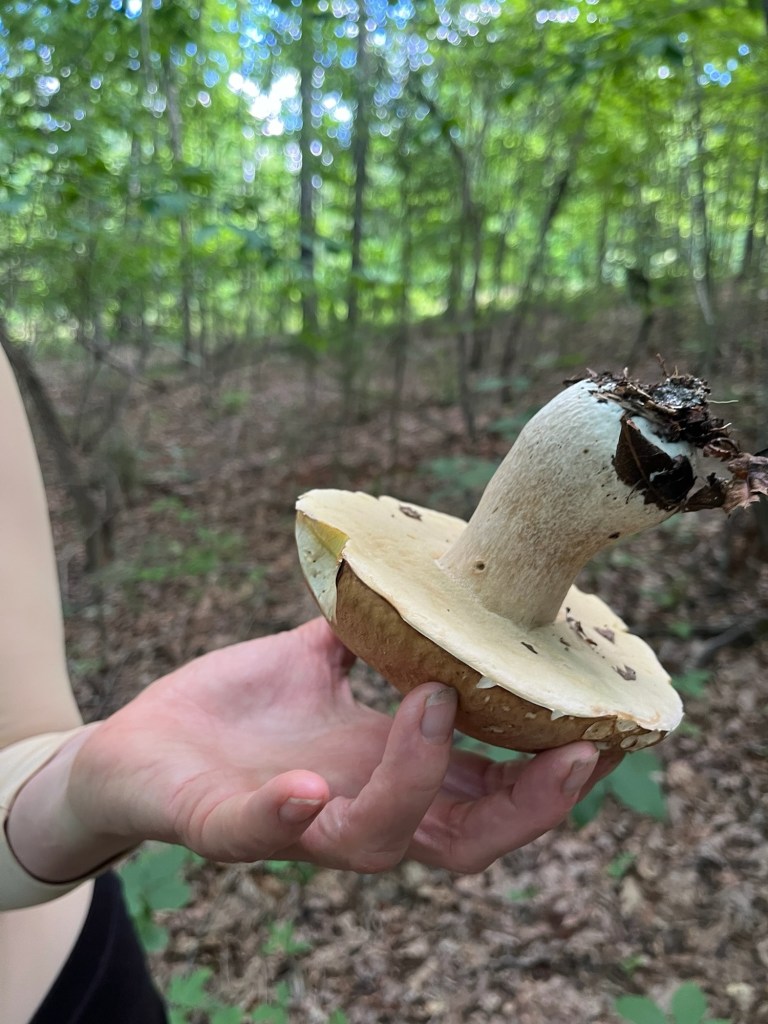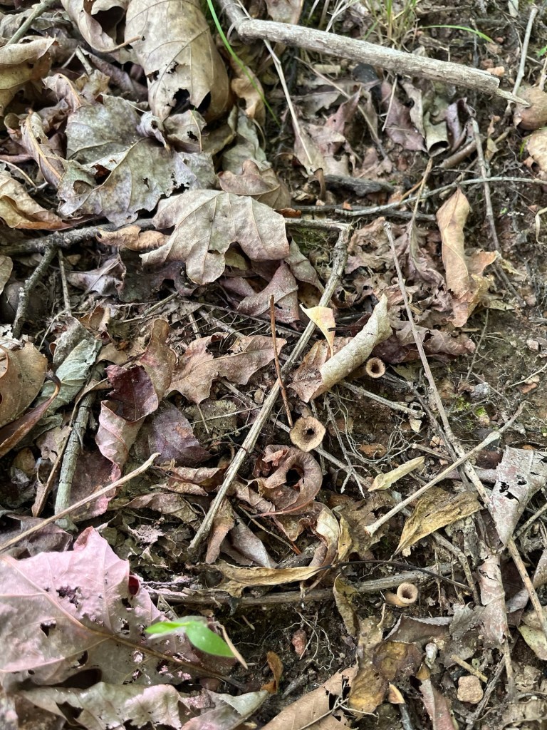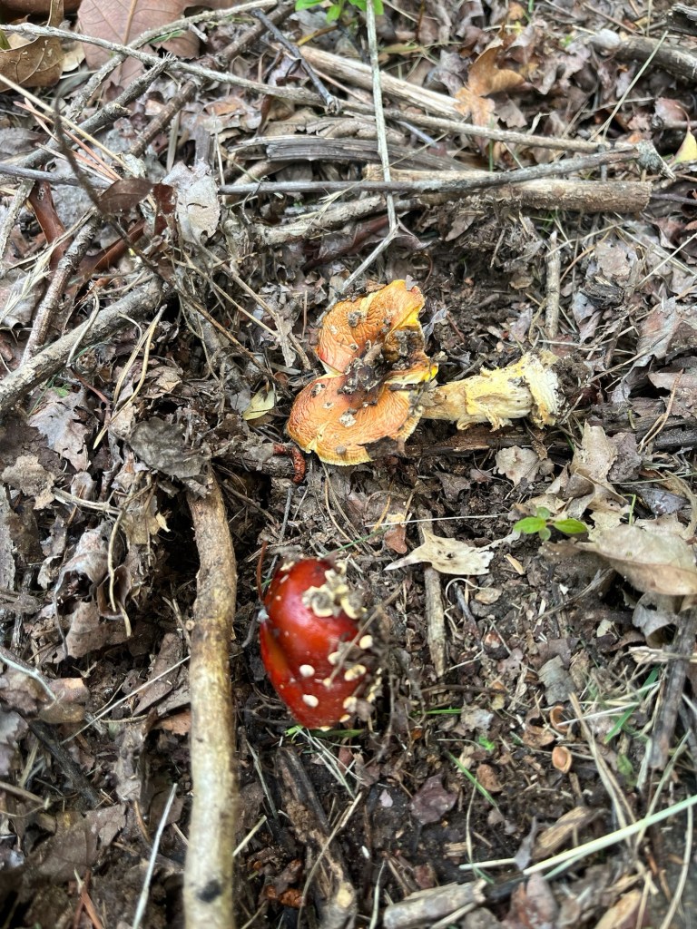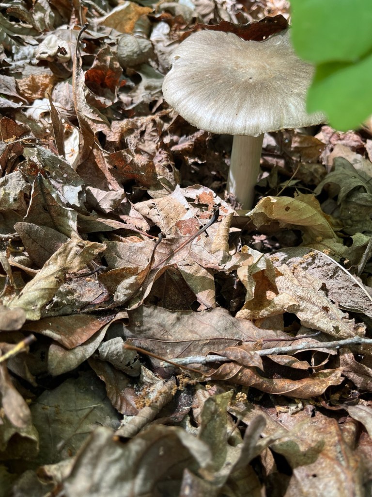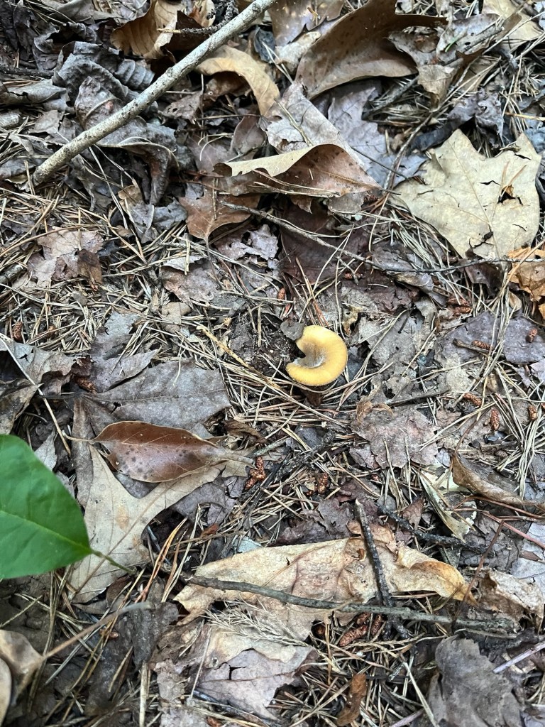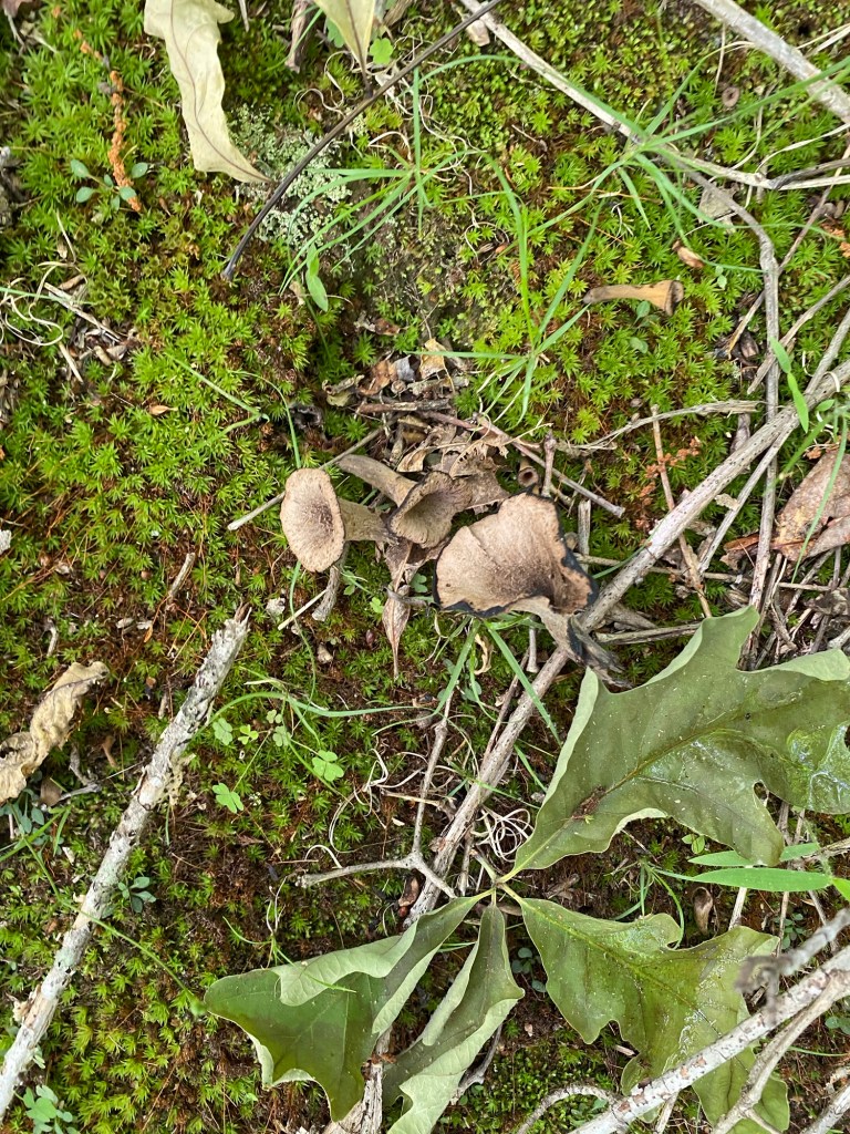 One of our first Bolete edulis mushrooms, common names the Cep, porcini, king bolete or penny bun, a most sought after edible. We’d been searching for a year and finally found it yesterday as well as black trumpets. Craterellus fallax, Eastern black trumpet, found along the southern set back line along the forest edge. Near oaks and nestled into moss growing directly from the forest litter. These are particularly difficult to spot as they look like leaf litter. We are so lucky. They looked like round tubes. These are a choice edible and are highly valued. Shoehorn oyster found along Blackrock trail growing on a stick. Amanita parcivolvata, False Caesar’s Mushroom, we are seeing these all over up top right now. The cutest mushrooms to spot pushing up through the leaves or pine needles with the bright red to orange cap dotted with white. Ailanthus, tree of Heaven, root suckers we’ve been pulling out from wherever we find it on the farm. This is a wonderful example of why to pull out the roots underneath and not mow or cut them since the root will keep growing and sending up more of this invasive tree that chokes out native species. Mowing the south end where we found the first of 5 porcini mushrooms yesterday. 👏🏽
