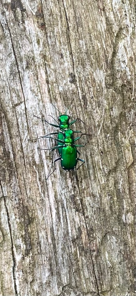 We found this colorful pair of six spotted tiger beetles down by the waterway at the south side. They feed on a wide variety of arthropods and over winter in larval burrows.
