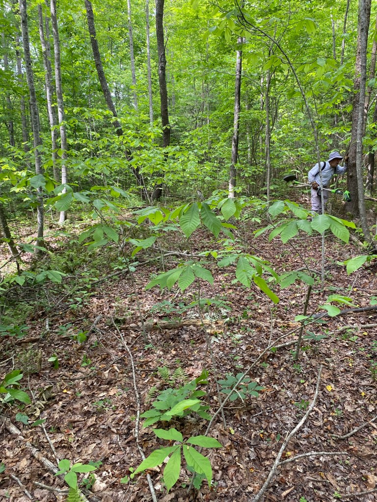 We continue to pull up and clear out invasive trees as we find them. So far, tree of Heaven, mimosa and paulownia are the invasive species and we find them mainly along the road. We also continue to take down black Cherry trees that are diseased and dying.