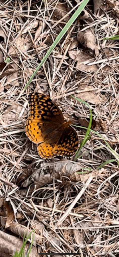Monotropa uniflora, Indian pipe or ghost pipe, found along southern set back line in the forest. These plants get their energy from their host fungus, Russula or Lactarius, so they can exist in darkest parts of the woods. We were delighted to find it at SAFF.The water was moving gently in the waterway at the bottom. Great spangled fritillary, Argynnis cybele, were fluttering all around the Southern set back line. Fritillaries are a smaller group within the butterfly family Nymphalidae. All butterflies in this family have tiny front legs that lack claws (in most other butterfly families, the front legs have claws). My daughter laughs at the Seussian names (fritillary, pawpaw, peduncle) of plants and insects from the farm.Amanita vaginata, grissette, an edible Amanita that lacks a ring in the stem. A large mushroom with furrows around the edge duplicating the gills underneath.American Amber jelly fungus, Exidia crenata, is edible but we’ve not tasted it yet. Used in pho or noodle dishes. Black and gold flat millipede, Apheloria virginiensis, found all along the south side. It is reported to secrete cyanide compounds as a defense. It is recommended that one wash hands after handling this organism as the toxic compounds it secretes are poisonous and can cause extreme irritation if rubbed in the eyes. (Source: Wikipedia)Chris looking for our boundary marker in pawpaw orchard. Fairy fingers, Clavaria fragilis, It produces tubular, unbranched, white basidiocarps (fruit bodies) that typically grow in clusters. Maple leaf viburnum Pawpaws Flowering lowbush blueberry