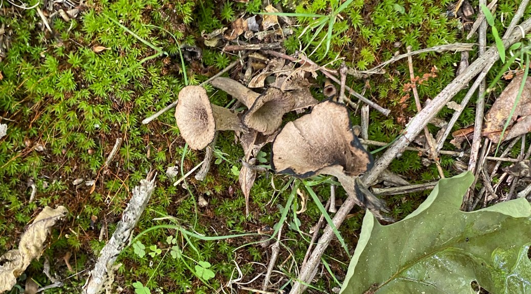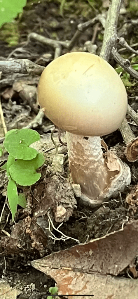 We were pleased to eat a few blueberries. We found them abundant and ripening first along the southern set back line, where they get plenty of sun.Eastern Black trumpets We ate yesterday’s black trumpets for breakfast this morning. We cooked them for 10 minutes on medium high heat in a dry pan, then lowered heat and added olive oil and garlic with a bit of salt and pepper. They were nutty, fruity and smoky. We enjoyed them as much as the golden chanterelles we found last summer. There are no known toxic lookalikes, so these are a great mushroom to forage . Some of our favorite mushrooms we have tasted. We performed some trail maintenance on ridge trail, made our way along the waterway, back over to the set back line and found more today. We harvested the largest and we can’t wait to eat these too. We made a trail up from the waterway to the Black Trumpet patches and beyond until we exhausted ourselves. We will call this Black Trumpet Way, it leads to the set back line.For now, this is unknown Amanita that we will watch this weekend. Notice the volva underneath the mushroom that it emerged from.
