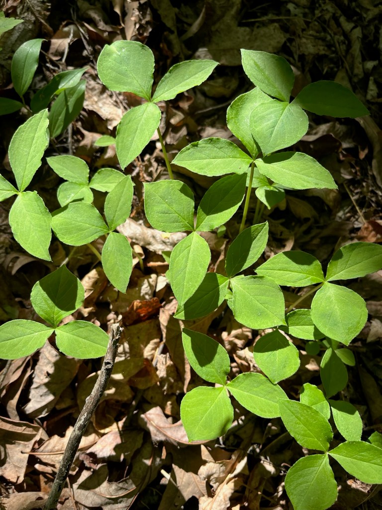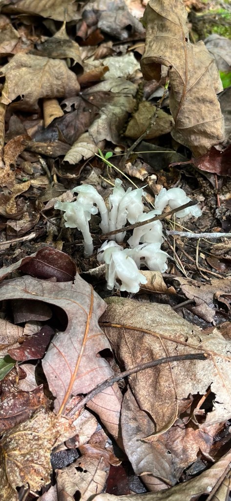 We found 9 or 10 of these Eastern American Platterful Mushrooms on the south side on the slope just above the waterway. They were big and impressive emerging from the forest litter. We’ve been searching for morels for months and hadn’t seen much of any fungi. They were a delightful sight for sore eyes. They are not delicious and some have been sickened by them despite the name “Platterful” so we left them there.