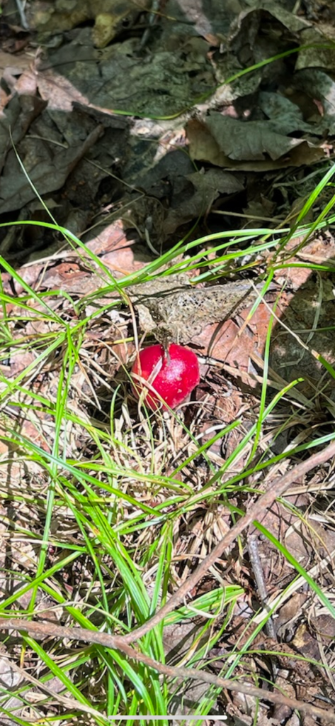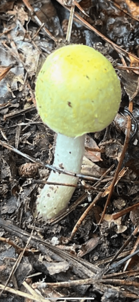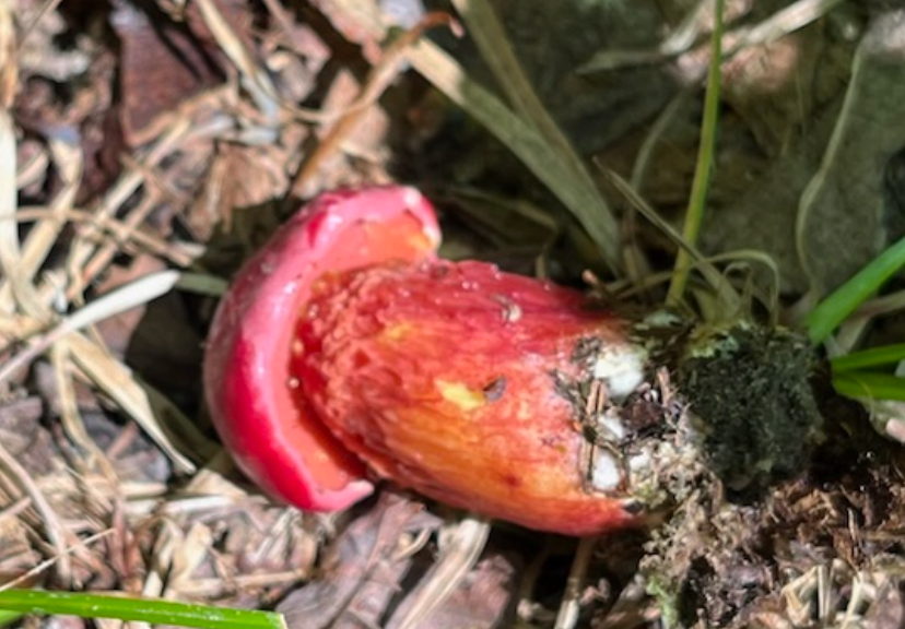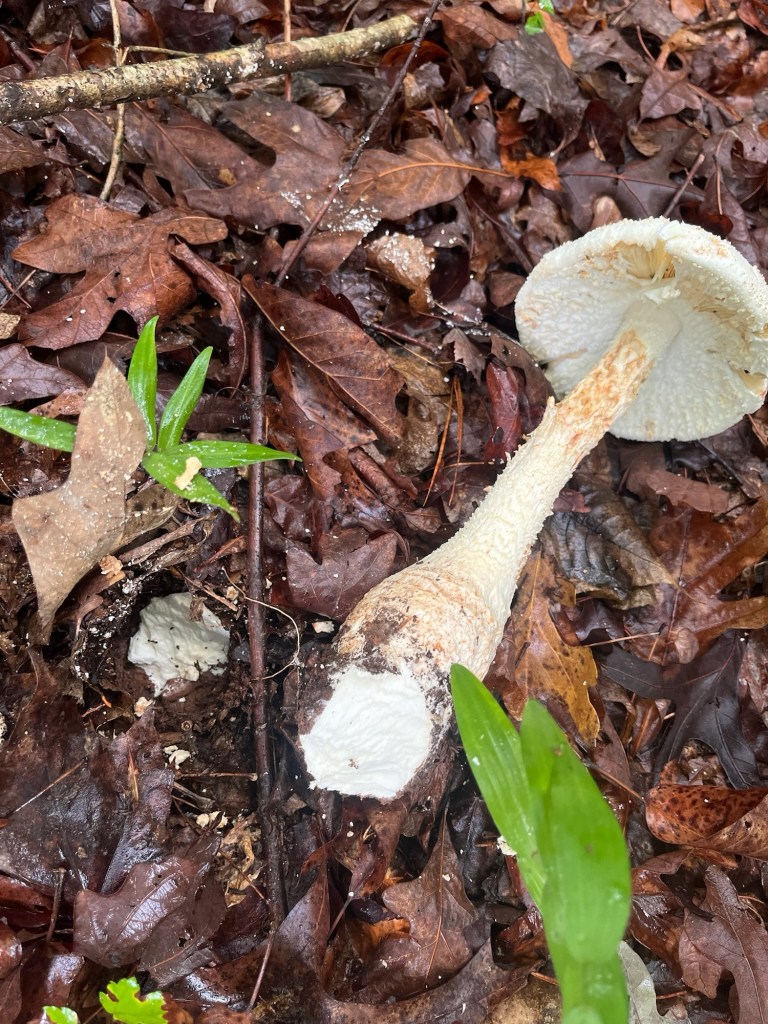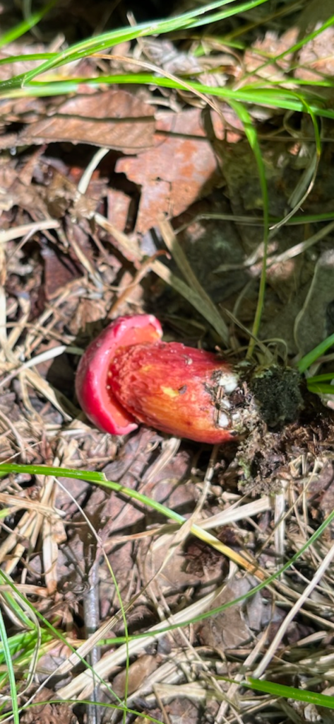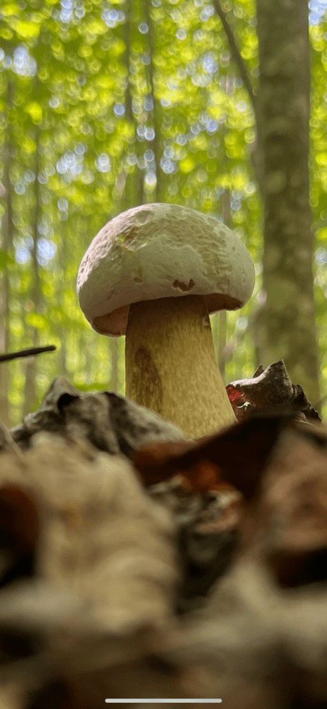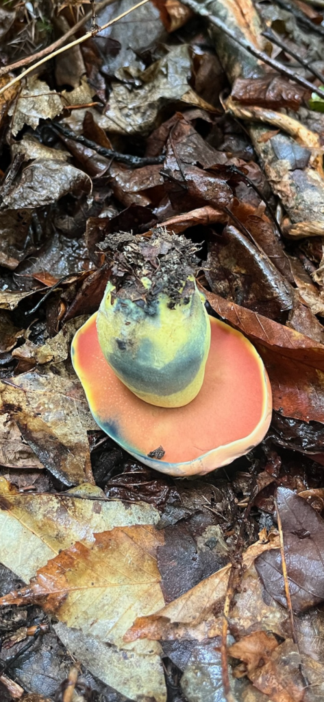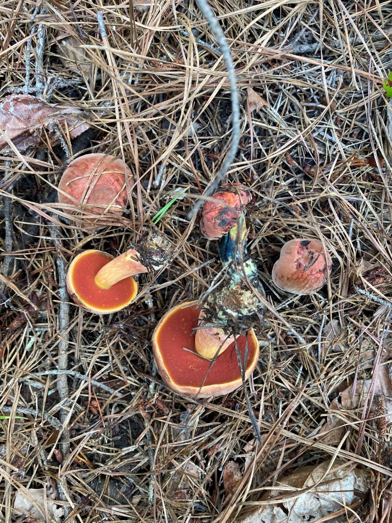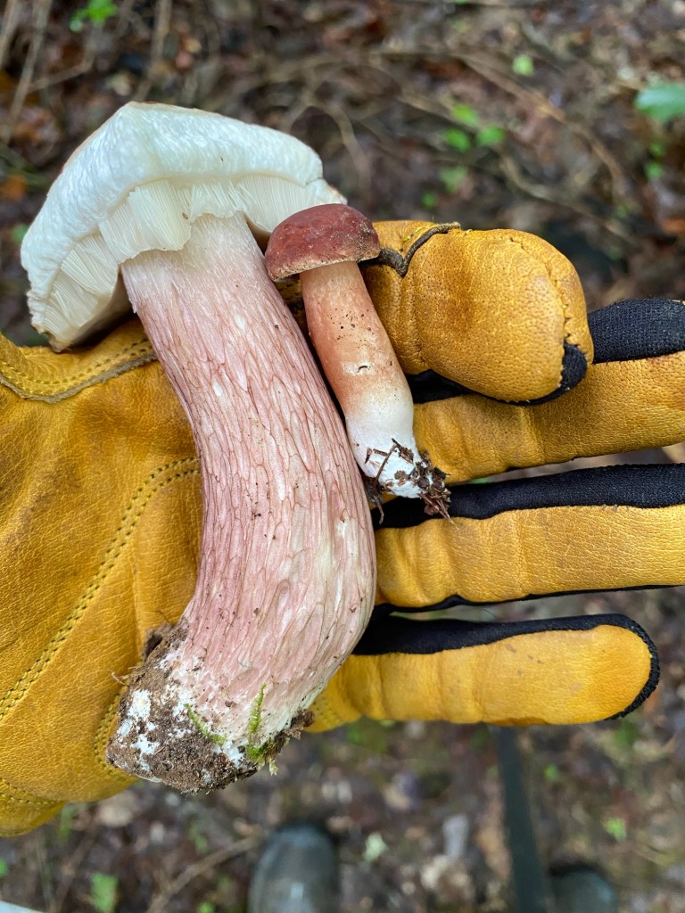 Mycelium appearing in white spots on the forest floor along Fern Way. Mycelium attached to Japanese stiltgrass roots an invasive we are pulling up where we see it in small numbers and plan to cardboard and mulch over it where it has a stronger foothold.Amanita rhopalopus, American Club-footed lepidella found near our road up top just before the south set back line. They had bugs all over them.Unknown Agaricus found in multiple spots along the south side.Frost’s bolete, Exsudoporous frostii, at bottom of slope near our crossing of waterway into the pawpaw grove. This was a spectacular sight. It’s edible and tastes acidic like lemon. Mycorrhizal with oaks.Top of the Frost’s bolete.Red mouth bolete, Neoboletus subvelutipes, is inedible and cause gastrointestinal distress. Red pores or spores are typically a warning sign with boletes. Boletus subluridellus a red pored bolete that is supposed to be edible. We have not tried it but reports are to boil first then it’s okay and delicious. Mycorrhizal with pine and oak.White boletes found in the flood plain below the slope at SAFF. These are edible. Leccinum holopus, white birch bolete or ghost bolete. White birch bolete were all over the bottom near the waterway. Lilac bolete, boletus separans, found with oaks and conifers and all over the forest floor at SAFF. These are delicious and beautiful mushrooms, a choice edible. We have found pounds of these.