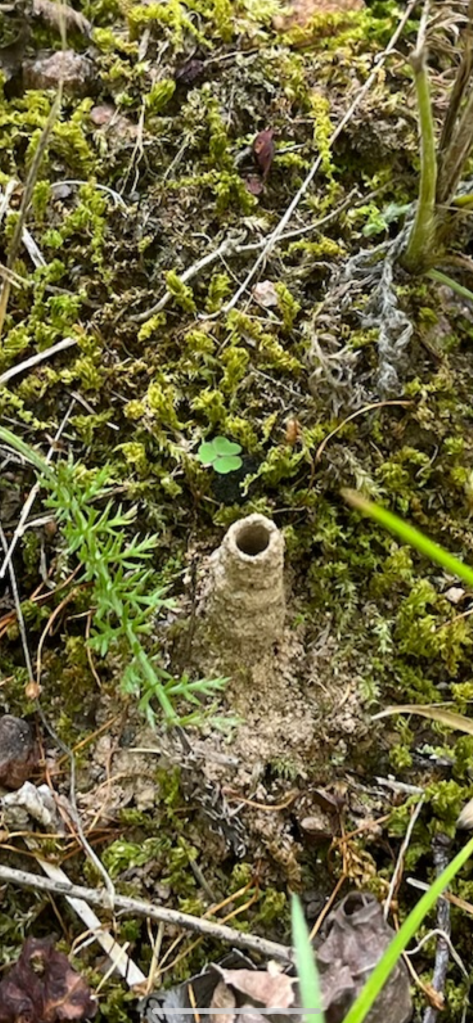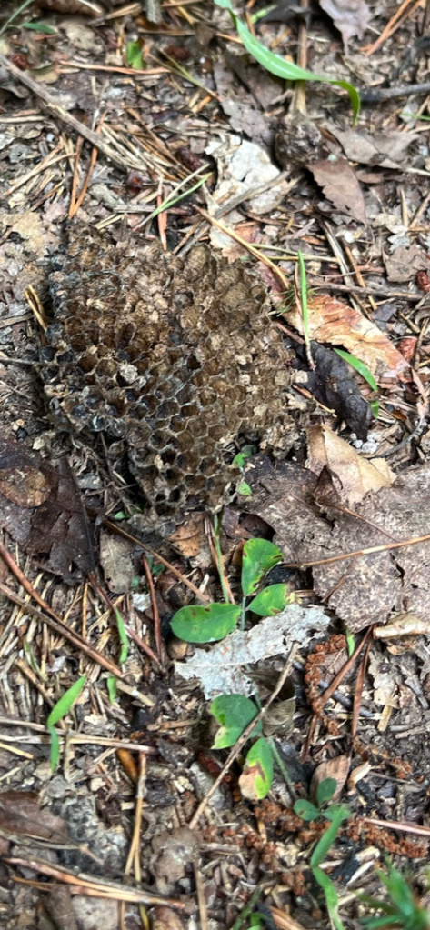 Is it really raining? We sat there in the truck and talked for a little while with the windows open, just letting the rain come in. Our spirits are lighter, with the return of rain to the Farm. We will be back in a day or two to forage with better prospects than we’ve had in weeks.Cicada chimney spotted near the waterway at the bottom of the slope. These chimneys are seen several weeks before cicadas nymphs emerge in wetlands. In dry areas they are usually seen as a hole in the ground. Evidence of an oak stem borer, Anaflomorpha sunpubescens. Natural enemies take care of these so no control is usually necessary.Unidentified honeycomb found at the bottom of North Trail. Unknown mushroom appears to be covered in Hypomyces.