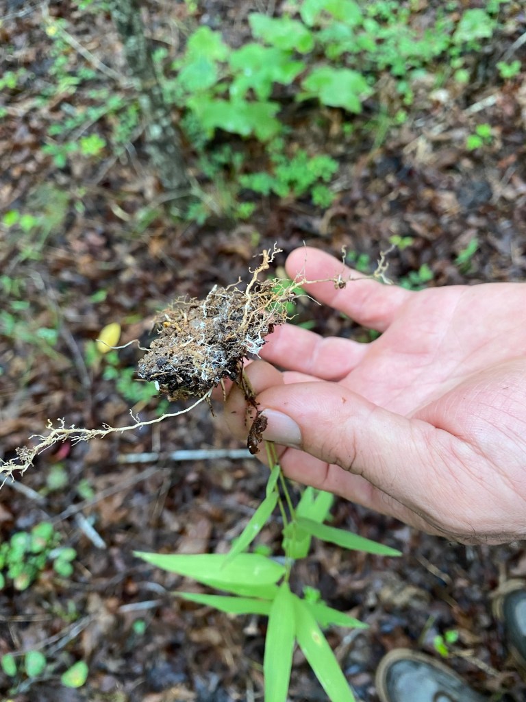 Smaller Ailanthus trees root suckering in a circle from the larger tree. These in particular would easily overtake the native trees and blueberries while creating a dense thicket if we don’t stop them. We pulled these out after a brief rain last week. The roots are shallow spreading and aggressive.