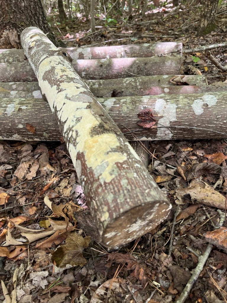 We also checked our lion’s mane experiment right off the clearing. Last fall we inoculated beech logs with lion’s mane mushrooms and yesterday we saw the mycelium creating something that looks like it may be what we hoped for.