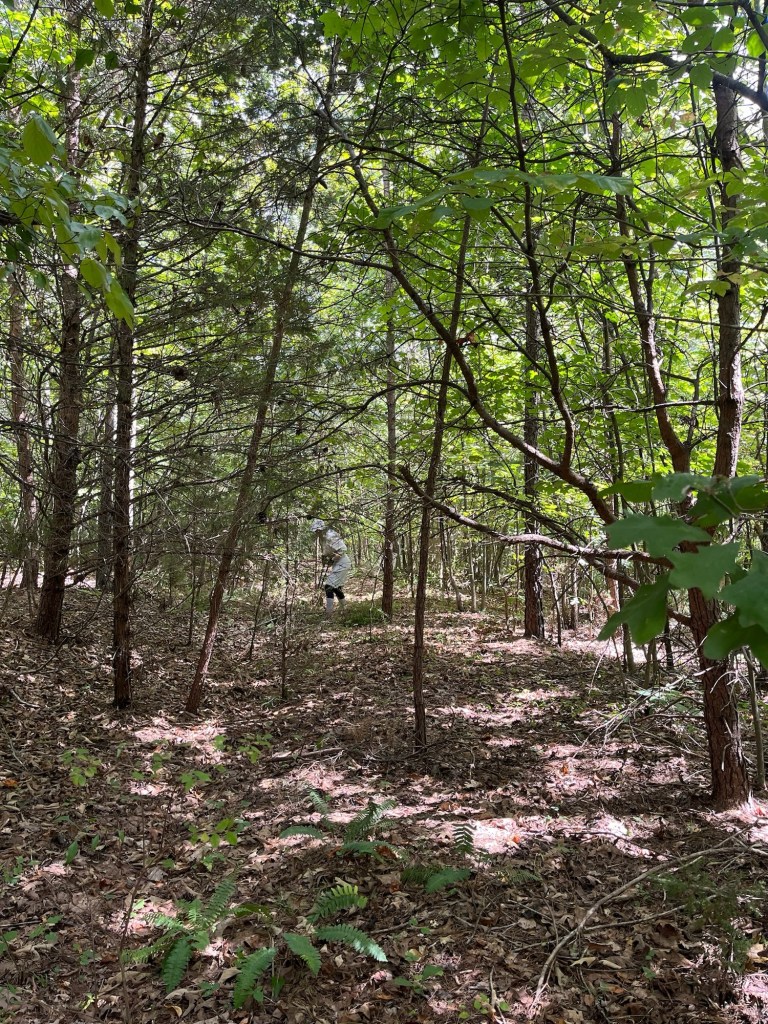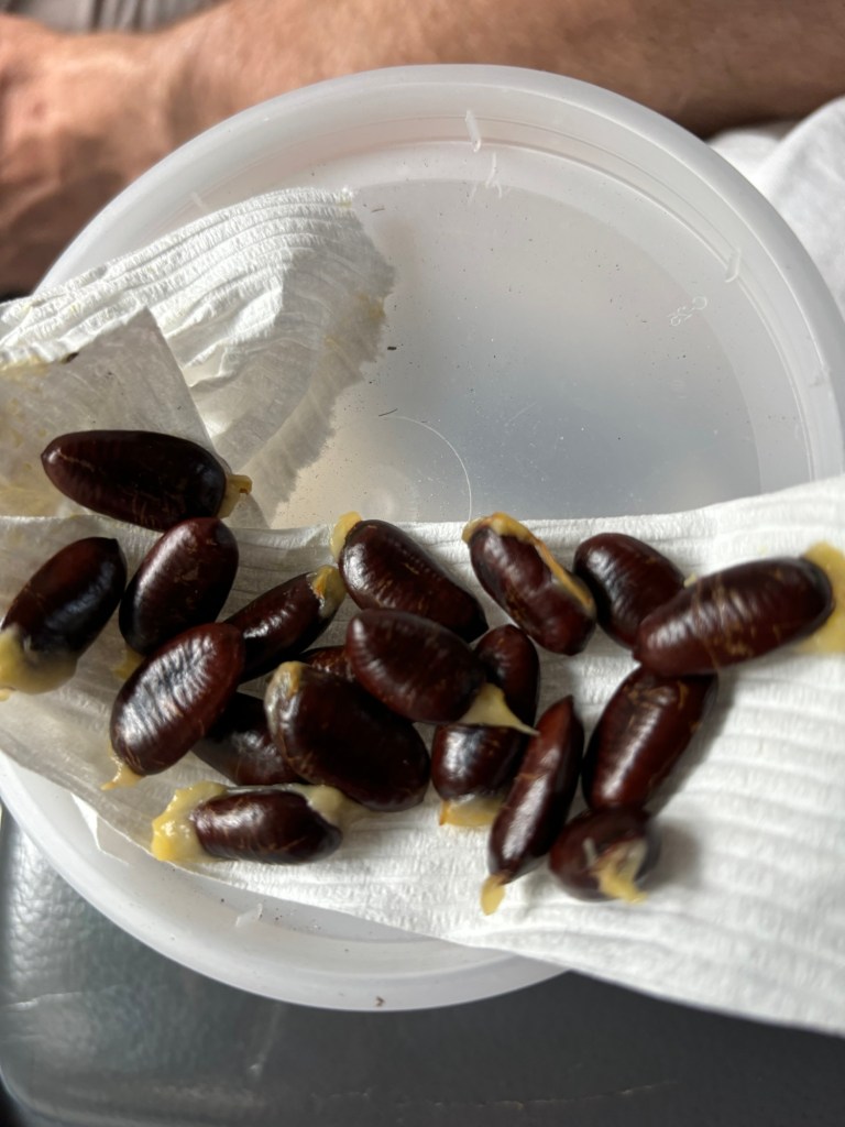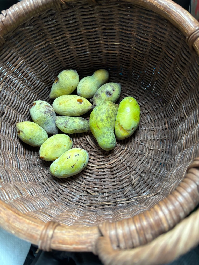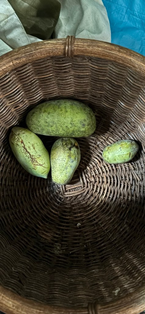 After a busy week, we wrapped up a few local chores and errands at home in Staunton, and started the holiday weekend Friday morning with a specific mission. Inspired by our visit to a local nursery last weekend, we hoped to find ripe pawpaw fruit in the wild. In particular, we wanted to collect some wild fruit to eat, and also collect the seeds to grow new trees with and bring novel dna to our pawpaw patch. We are saving all of the seeds from our fruit and we are going to plant them at the farm. A dedicated search on the iNaturalist app showed us locations along our route from home to the farm in Buckingham County where pawpaw trees, flowers and fruit were observed and identified. Some of the observation sites along or near our route were private land, so we ruled them out. But we began to notice the pawpaw trees by the side of the road as we drove to and from the Farm. Especially where rivers, creeks and streams crossed the road. We saw Black walnut trees and many pawpaw trees. Having tried a couple ripe pawpaws last weekend, we figured it would be worth stopping to take a look if we saw accessible, fruiting pawpaw trees. They fall off the tree when ripe. So far, we have found about 20 in various stages of ripeness. A few were so far gone, we had to just plant them in a pot. We have at least a hundred seeds now and we have them stored in the refrigerator. We’ve also gotten to eat a few of these creamy, tropical-tasting native fruit.
