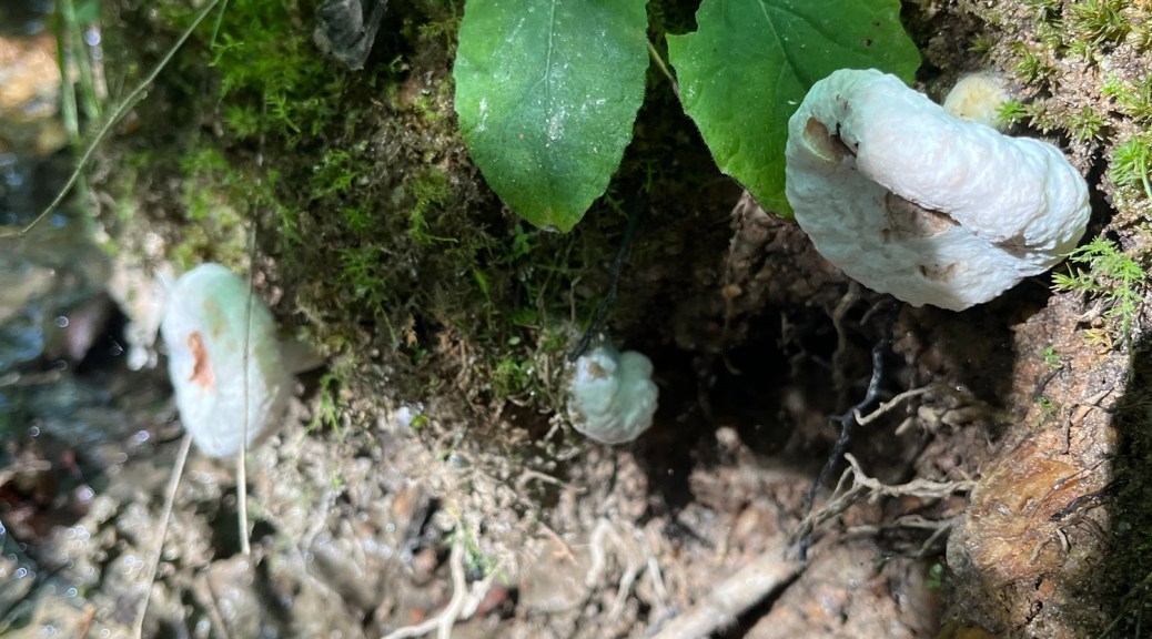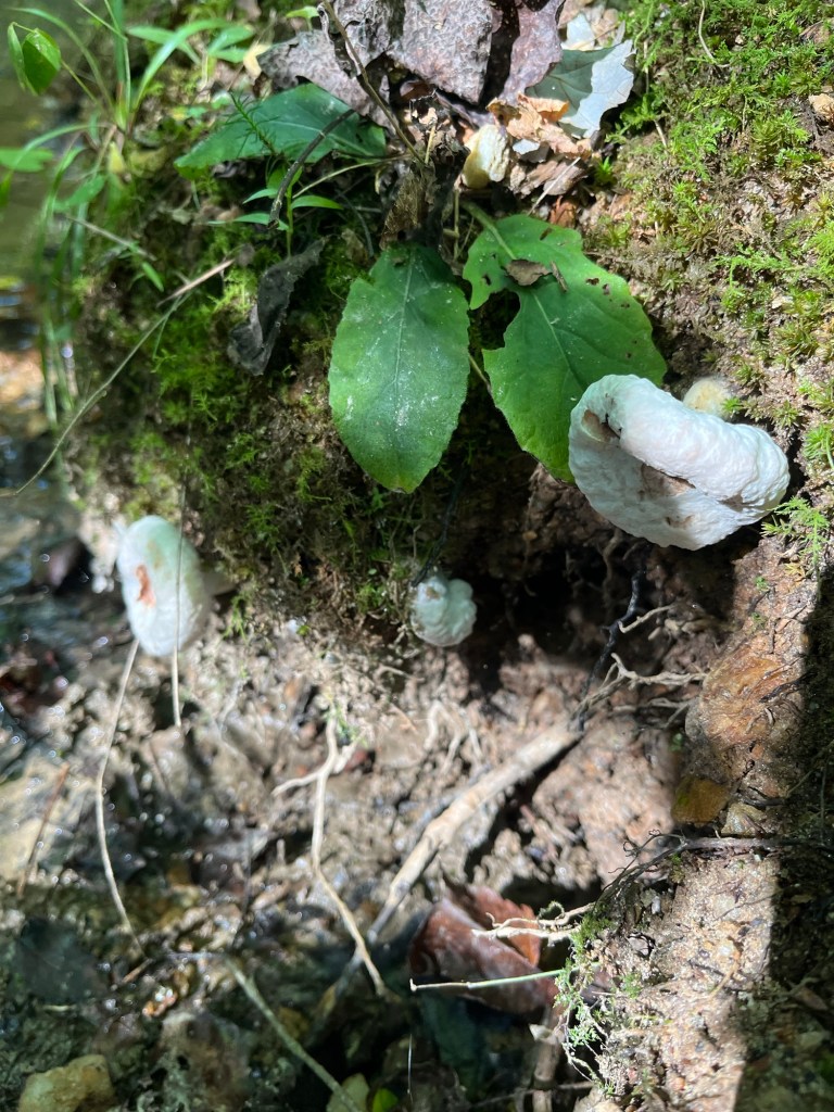 These shrimp of the woods are growing on roots and dead wood along the sides of the waterway. They are decomposers.