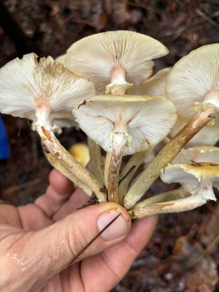 We’d been waiting for these to emerge along with the Entoloma abortivum which are actually honey mushrooms parasitized by Entoloma. Each year they show up together and it is a helpful identification factor. They are delicious and we are having them for breakfast this morning with our eggs.
