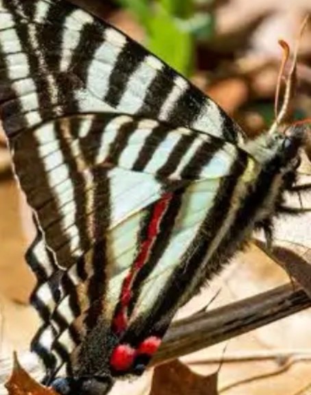 An energetic zebra swallowtail butterfly flitting about the old clonal colony pawpaw patch.