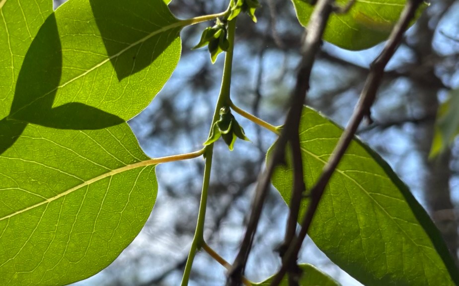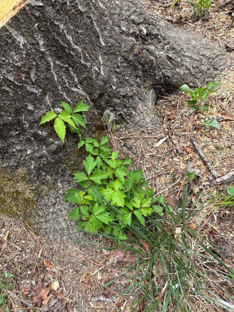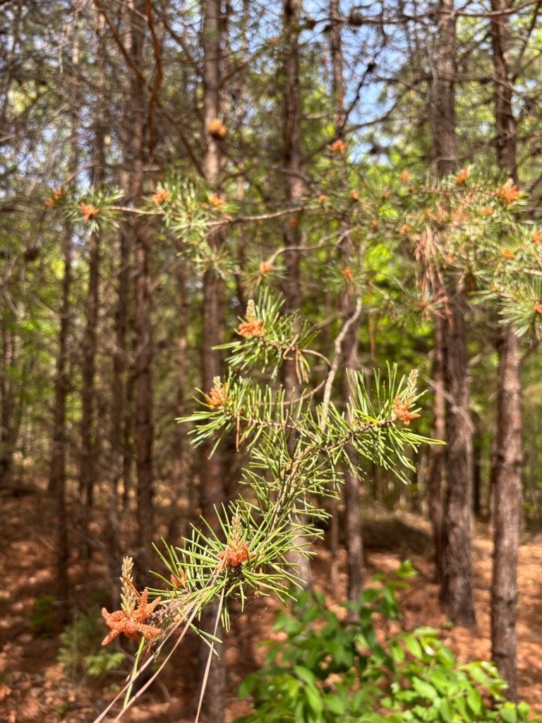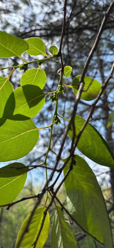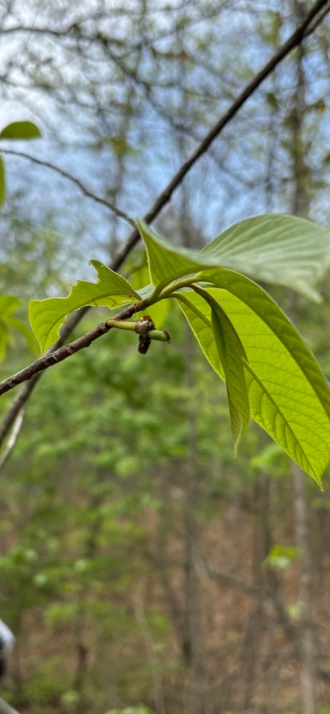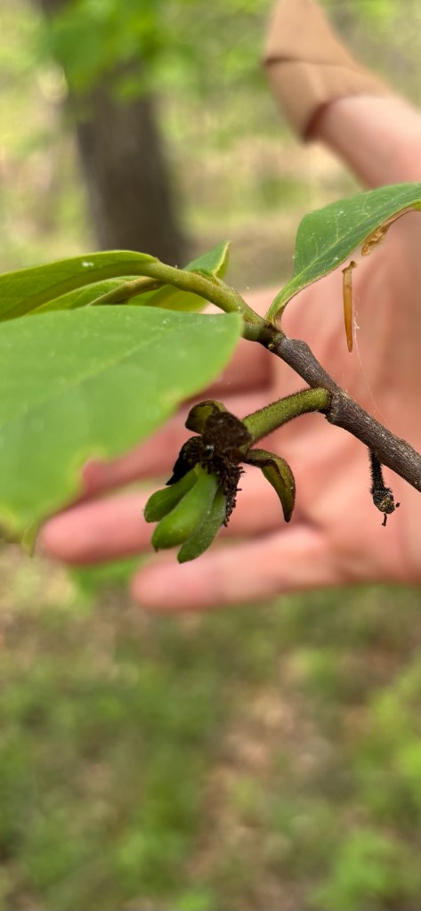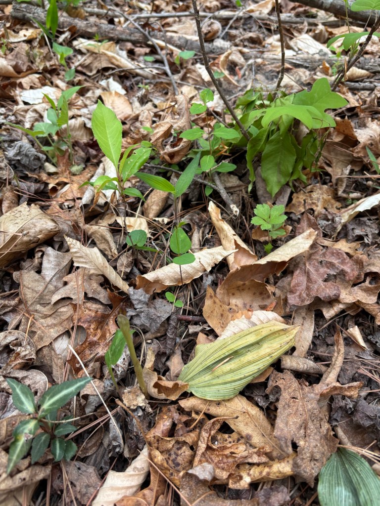 We got out to the farm this morning to get a few things done and take a walk. The forest is getting fully leafed out and it looks like summertime in Virginia all of the sudden. We were happy to see a few surviving pawpaw fruitlets still there after the wide spread but scattered frost damage in all three pawpaw patches. The persimmon trees are starting to get flower buds. We saw American hog peanut and creeping bush clover growing near our trees and feeding them nitrogen underground. Mountain laurel is budding up in the woods. We saw Aplectrum hyemale, putty root orchid, sending a flower stalk up with a leaf wilting and dying back in late spring/early summer.
