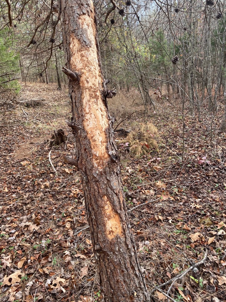 This could be black bear or woodpecker. Most likely not deer. We have ruled out porcupine because they aren’t found in Virginia anymore. The trees with the removed bark are all dead conifers. Something is trying to get to the bugs underneath or maybe eat the bark, we wonder. …