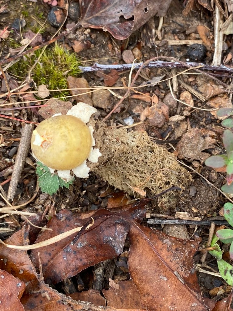 Amanita. Note the veil having just freshly fallen. This could be the death cap, Amanita phalloides. Half of one is enough to kill an adult human. The principal toxic constituent is α-Amanitin, which causes liver and kidney failure. Thus, we leave anything that looks similar alone.Top view of the large Amanita. It was 5 to 6 inches across. This mushroom was beautiful and we left it in the woods. They are mycorrhizal with pine, oak and chestnut trees. Another boundary marker and sign we posted today. Arising from hardwood leaves and sticks, these tiny beach umbrellas are quite beautiful when fresh. The pleated cap, the wiry stem, and the very distant gills make the Marasmius easy to recognize. Other “pinwheel” Marasmius species include these Marasmius fulvoferrugineus, with a rusty brown cap. We saw hundreds of these tiny mushrooms growing on the leaves of our forest floor.Pleurocybella porrigens is a species of fungus in the family Phyllotopsidaceae. The species is widespread in temperate forests of the Northern Hemisphere.[2]P. porrigens, known as the angel wing, is a white-rot wood-decay fungus on conifer wood, particularly hemlock (genus Tsuga).[3]The flesh is thin and fragile compared to the oyster mushrooms (Pleurotus ssp.).Coral fungusThis variety of the well known species Amanita muscaria is distinguished by its yellow to orange, rather than red, cap. Other trademark features are shared with the red version: numerous warts on the cap, a ring on the upper stem, and a distinctive stem base that features several shaggy “zones” of universal veilmaterial on the upper edge of a basal bulb. Amanita muscaria var. guessowii is found in the northern Midwest and in eastern North America from the boreal forests of the northeast, south to the Appalachians.Gills of Amanita muscari var. guessowii the American yellow fly agaric. Closely resembles Amanita ceasarea but is noted to be poisonous or have unwanted effects and to be edible. We leave them in the forest.Yellowing Curtain Crust, Stereum subtomentosum, is easily confused with Trametes versicolor, the Turkeytail bracket fungus (which differs from Stereum species, however, by having tiny shallow pores on its fertile undersurface), this rather uncommon bracket grows on dead hardwood, and most commonly on Beech. Like many other crust fungi, Stereum subtomentosum can be found throughout the year; however, its period of sporulation is limited to the summer and autumn. Coral fungus