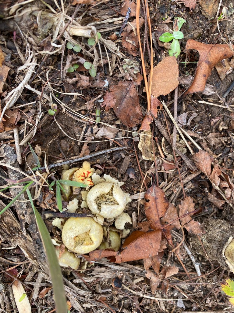Either boletus sensiblis, hortiboletus rubellus or boletus subvelutipes. Photo credit: Chris Okay 👍🏼 The top of the unidentified bolete.Hygrocybe tops found along bottom edge of clearing. Underside with gills of waxy cap. The second time we have found a small puffball mushroom along the driveway up on top of the hill.Yellow necked caterpillar, Datana ministra. A moth in the family Notodontidae. Found along the new path we made along the south west end of property near the power lines.We saw many mosses and ferns along the edge of the waterway.Boletes popping up, Chris’ foot is pointing at another beginning to push through the layer of pine needles.Animal dens in the stumpery.