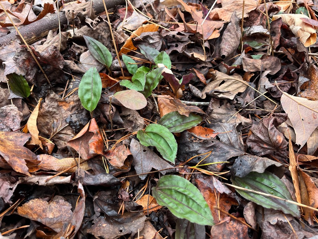 Tiny trees needing to be thinned. Crane fly orchid leaves emerging from the ground where we saw the flowers earlier this summer.