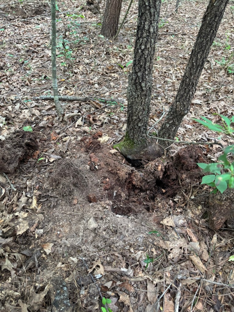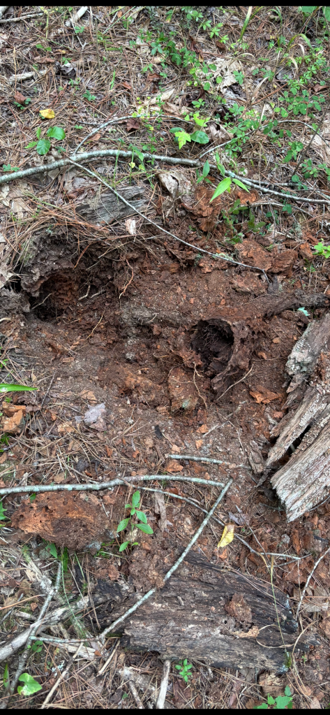 We continue to see evidence of bear activity and we imagine it is she. This past month we began noticing old tree stumps destroyed and large pieces of quartz turned over. We immediately suspected our bear was looking for insects to eat. The first we noted was in the spring along the back line on Chanterelle Hill Trail. A huge ant hill was dug up and excavated. Then about a month and a half ago, we saw all along the north property line she had dug up old stumps. At one we saw yellow jackets looking disturbed.
