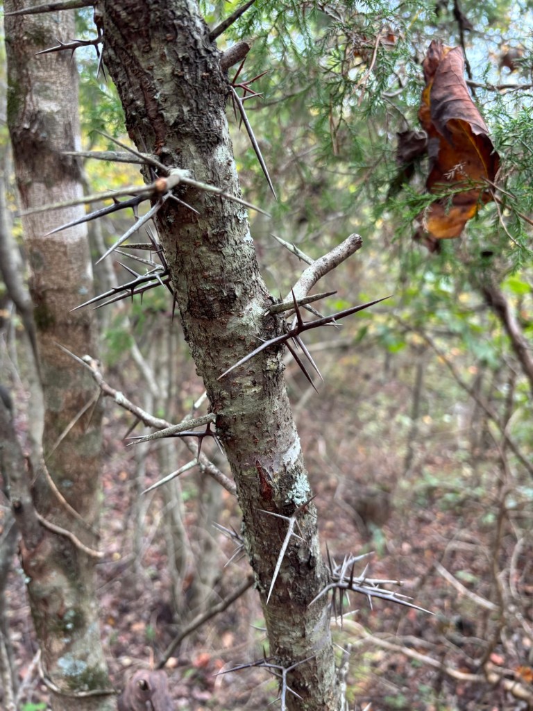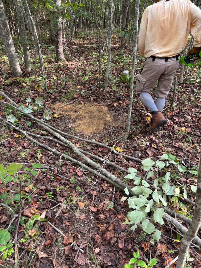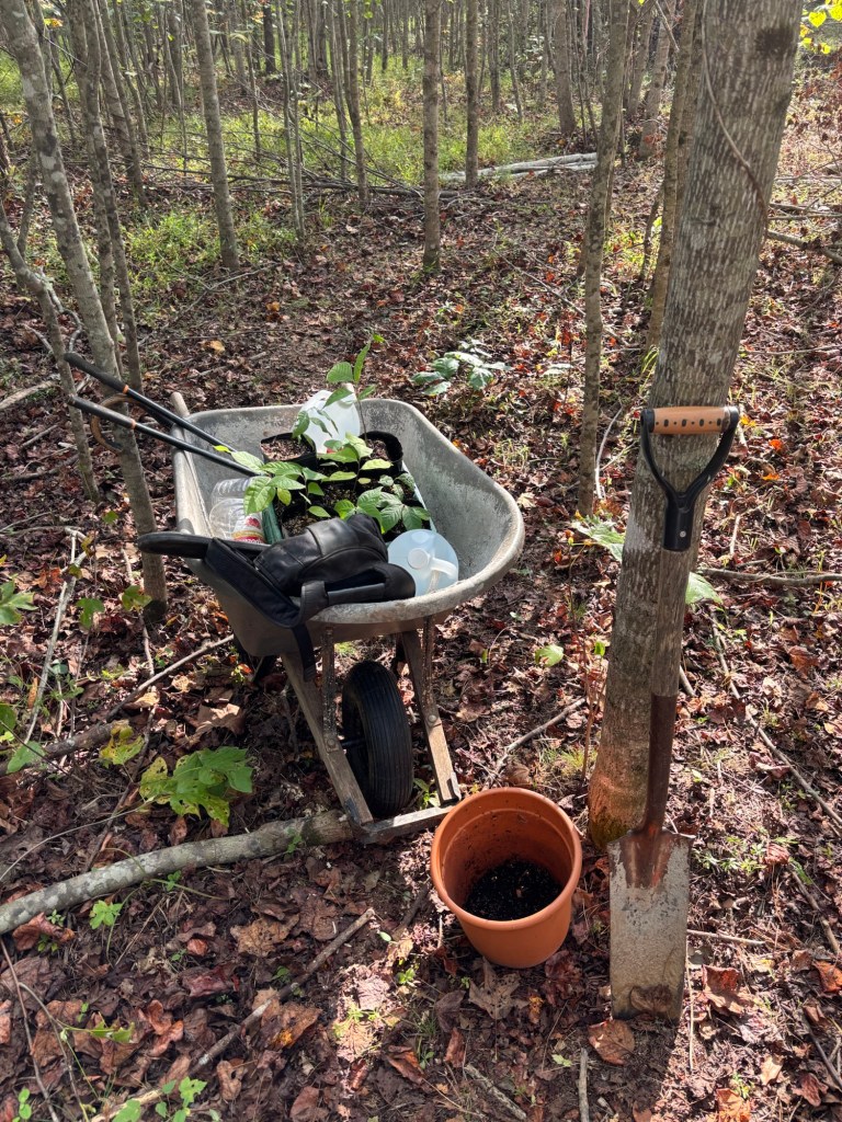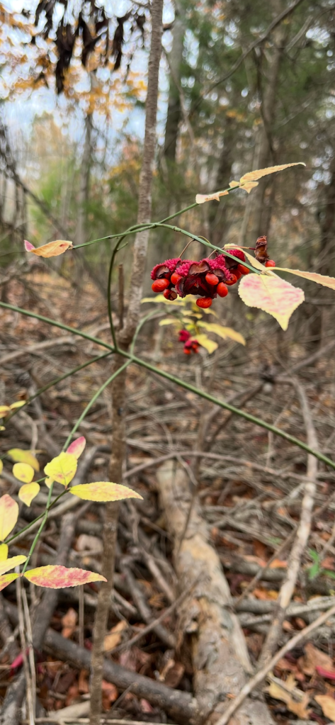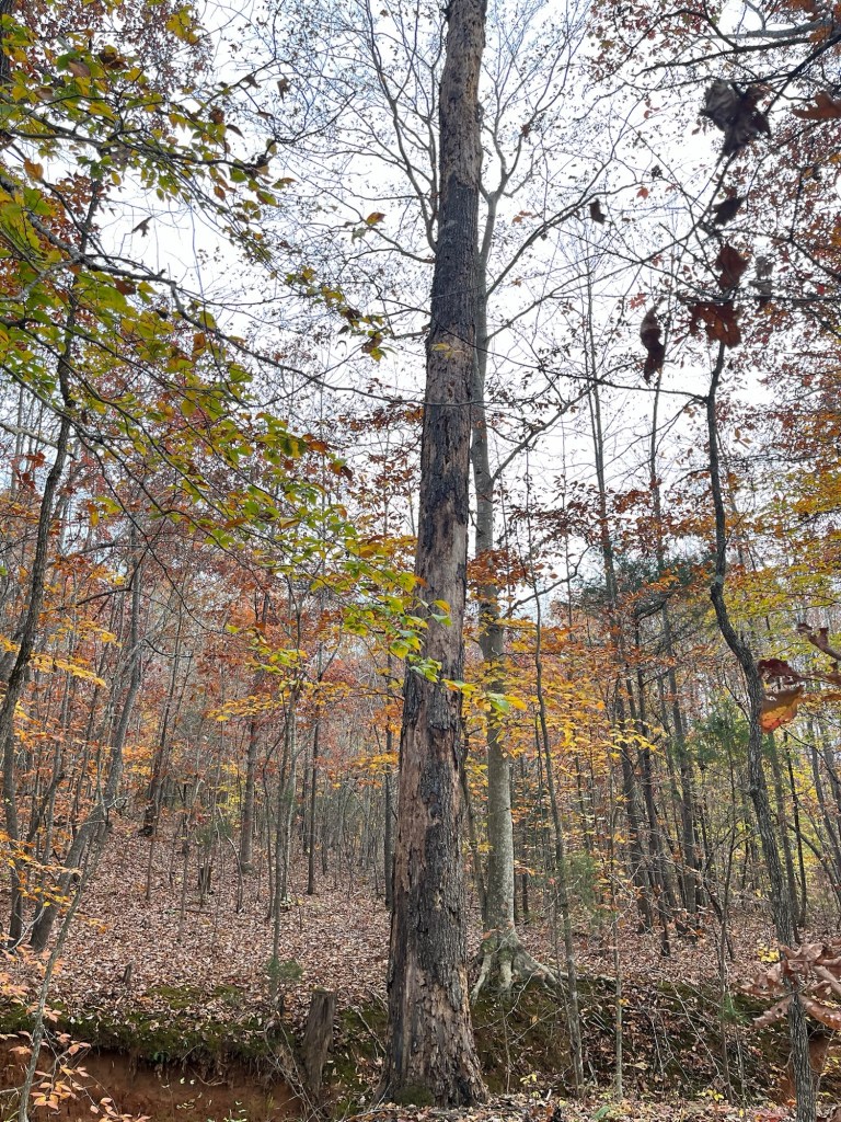 We unloaded the lumber we found at the Restore and checked out the pawpaw and fig trees planted up top. They have yellow leaves and are losing most of them. Then we headed down Red Hawk Road to get down to Fern Trail. We checked out the Rappahanock cultivar and the seedlings planted as well as the cluster of natives. Most have gone fully dormant for the winter, especially the native SAFF trees. A few of the cultivars and seedlings look great; fully leafed and deep green still. Gleaming. It’s more typical for them with the temperature and season to be dormant. We have not yet had a hard freeze in Buckingham, or in Staunton in the Valley—which usually frosts first. Once dormant, their watering needs will drop. Phew! 😅