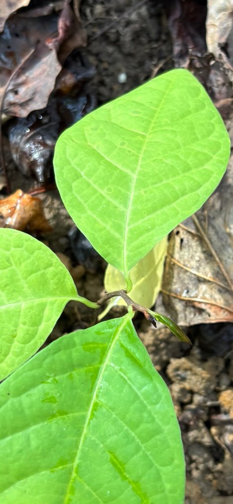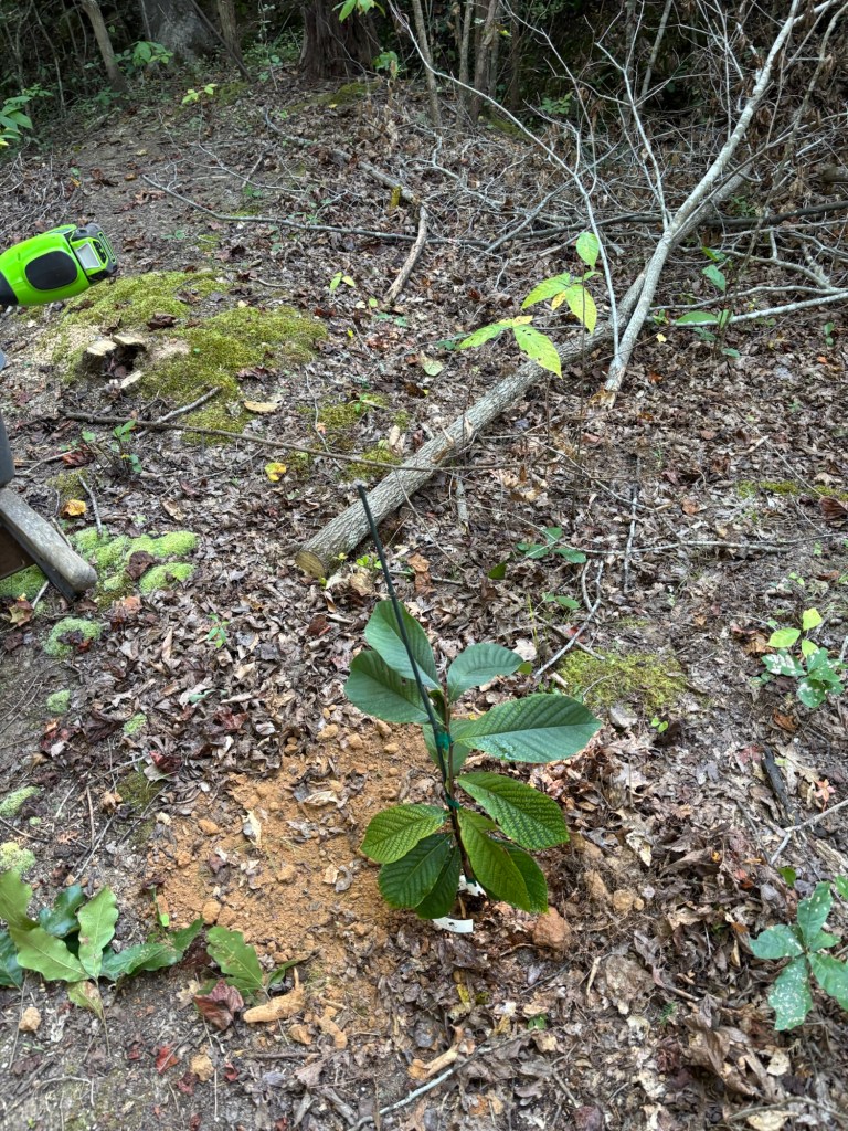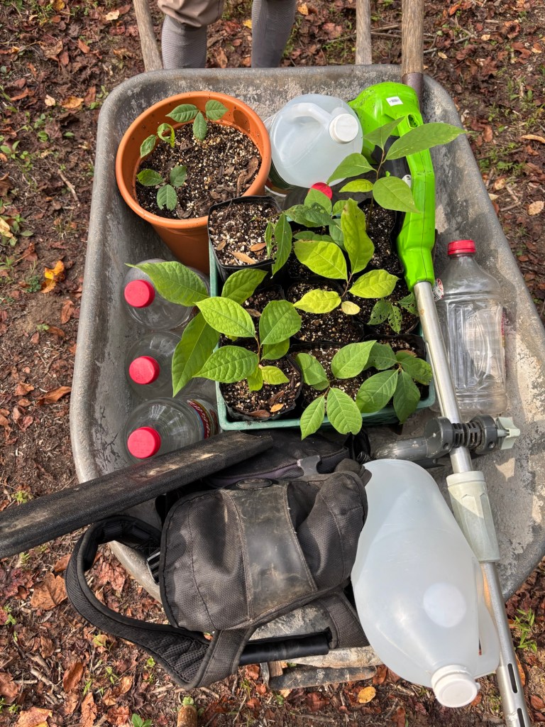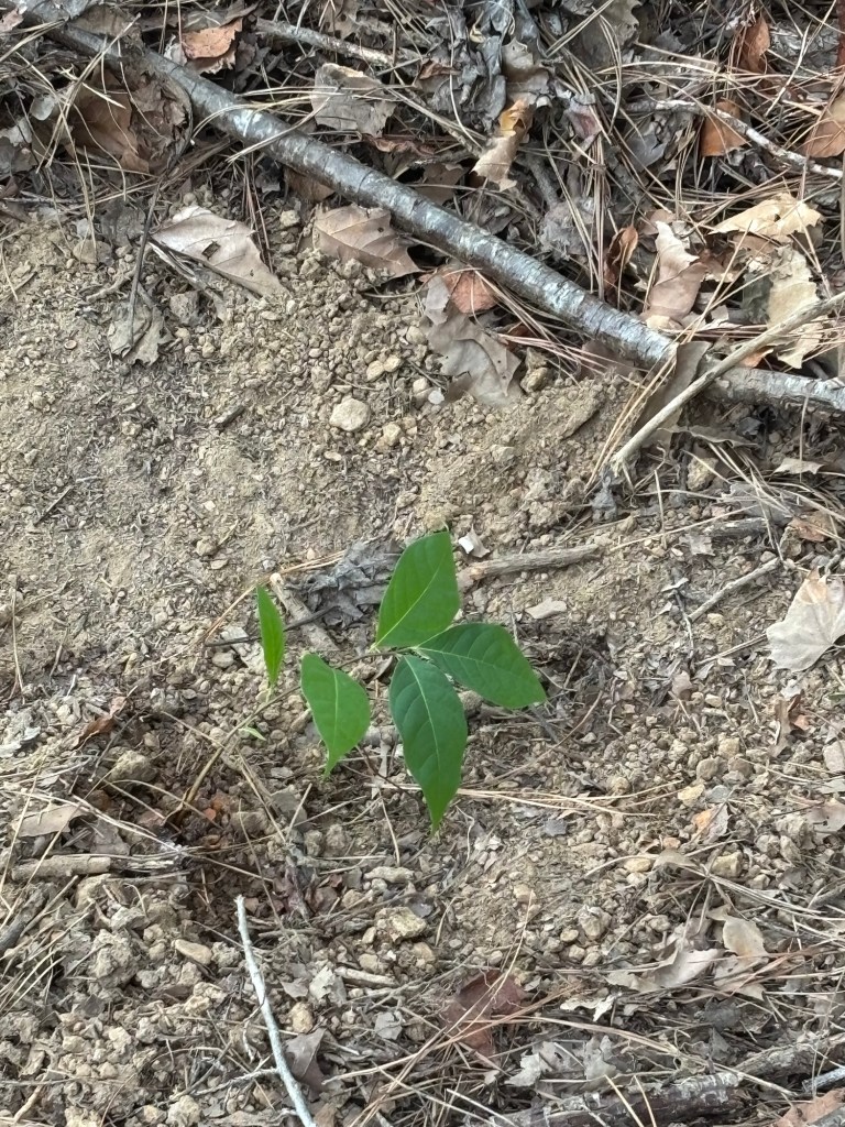 Then we went back out on Sunday to water what we’d planted Friday and put a few more in the ground. We planted 5 up top in the main clearing along the driveway and put two along the South Gully on Dan’s Folly. We put one more across next to a lone wild SAFF native pawpaw on Fern Trail. From there, we walked down the Gully and watered our select seedling planted a few days before. We were happy to see they all were still in the ground (last year, the deer ate them and pulled them out of the ground a day after we planted so we almost expected the same.) They were glowing in fact. They all appeared to be very happy in their new locations. We watered them some more.