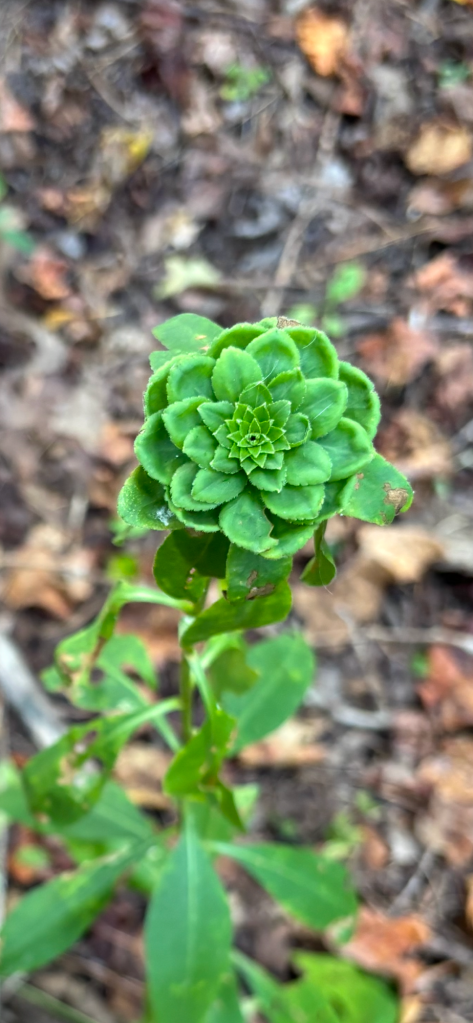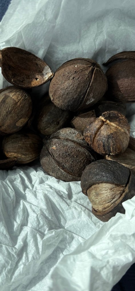 Yesterday, we visited Saint Andrews Forest Farm to work on our road project. We are bringing the road from the main driveway to the old farm road on the north side, in order to use the tractor to access the new Pawpaw orchard we’ve planted the past few years. We will need it for everything —bringing trees, compost, compost tea, water and collecting and taking mulch to the pawpaws. So far, we have carried everything in backpacks and our wheelbarrow. Phew! We have road access already with the tractor to the south end and the Old native SAFF orchard. We just ordered a trailer for the tractor that will hold up to 750 pounds. It will come tomorrow and we will get out there to use it to transport compost to the SAFF old native orchard at the bottom of the main hill. We’ve been wondering if this orchard was planted and farmed by Native Americans in the area. Or if it arose from just one tree and is made up of clones. Or both. The trees look old. They could be hundreds of years old. While individual root suckers only live around 40 years, the clonal root system can live for centuries. One reason the trees aren’t producing fruit may be because they are all clones of one mother tree. This is most likely. They need novel dna. So that’s why we started planting new pawpaw seedlings and cultivars. These older native trees at SAFF have flowered in mid April in 2024 and 2025. The first year we noted 15-20 flower buds. In 2025, we had fewer than that with the drought and none of these produced fruit. After we hand pollinated both years, we got fruit to set but they dropped within a month or so. This year every tree that’s over 6 feet tall has dormant winter flower buds all over them. Hundreds of hopeful fuzzy little round nodes everywhere. We are beyond thrilled. An unexpected surprise!