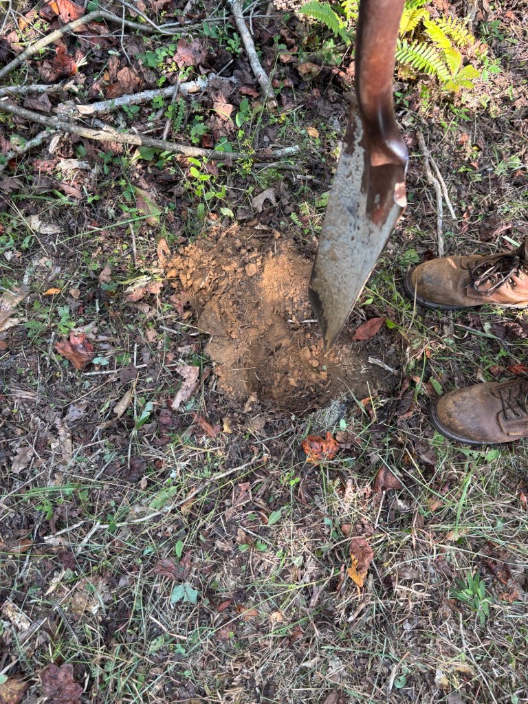 We went out to the farm on Friday and Sunday to get as many pawpaws planted before the rain comes. Thunderstorms and rain are forecasted to get started late tonight and continue until Wednesday afternoon. We planted 17 on Friday: Five in the orchard (a Kentucky State University Chappell and 4 seedlings) and another five alongside the Shenandoah and select seedlings that we planted last year. We put a Mango cultivar and four seedlings we started from foraging. Then we planted 2 on the Pawpaw Peninsula (an Allegheny cultivar and Wild native seedling from a Rockfish River foraged pawpaw). After that we put two by the pawpaw patch at the bottom of Ridge Trail and another two on the left side of the large pawpaw grove. We walked up Ridge Trail and put another wild pawpaw seedling from Rockfish River foraging near the small colony of native pawpaws growing along the south wet weather gully.