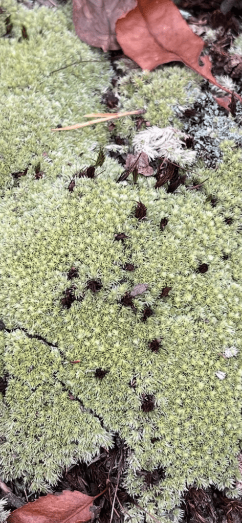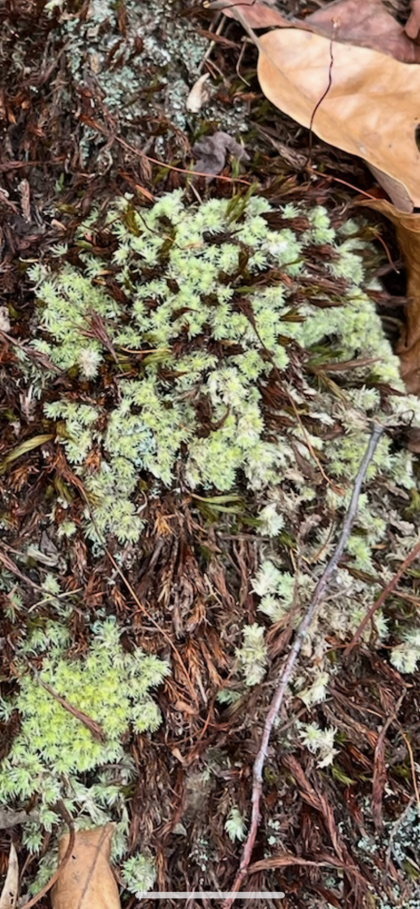 Along our walk we found white moss and strawberry euonymus (Euonymus americanus). We also went down to the waterway to check on this oak snag in the picture below. SAFF had high winds for several days and the last time we saw it, there was a bend and crack starting.