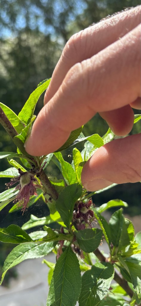 We got out to the farm yesterday to check on the tiny house and continue to level it up. We’re placing cinder blocks around the trailer to support it. We also continued to pollinate the newly opened small, green pawpaw flowers. We see tiny initial fruit set has occurred as well as new buds opening.