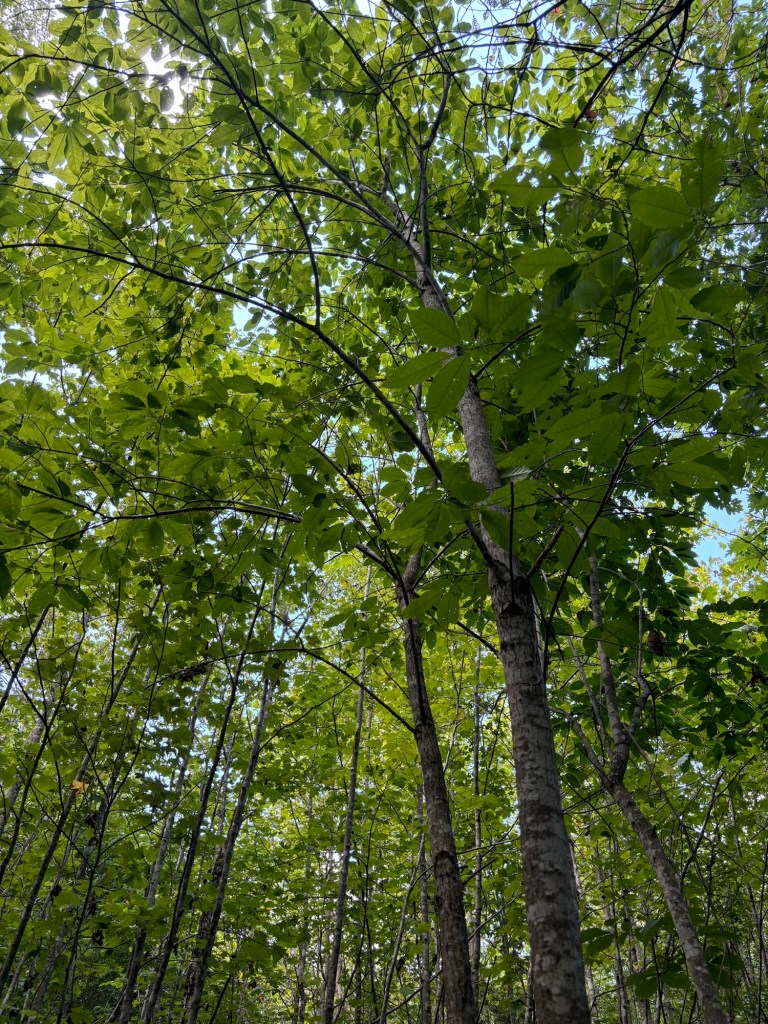 We’ve been battling an invasive tree called Ailanthus or tree of Heaven. We found them last summer in three different spots all up top near the main clearing and by our neighbors to the north. Another name for Ailanthus is Chinese sumac. Differentiation between Ailanthus and our native shining sumac, Rhus copallinum, was a challenge initially with the smaller specimen. However, now we can see the difference between them easily with our practice watching over our forest floor.